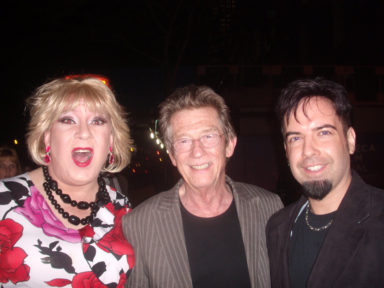 Quentin Crisp was a pioneer, and his unique brand of gay activism is clearly different from that of many of us today. He didn’t demand respect or equality. He earned it, merely by refusing to fit in and by refusing to censor his opinions or views. Arguably, he seemed to have viewed respect, equality, and even love and prosperity as a privilege rather than as rights . He found a great deal of what he was looking with the new social freedoms of New York City late in his life. Early in the movie, he states, “I was never the kind to grab life by the throat… I was merely who I was, and for that alone I was beaten.” Yet, its unlikely Crisp ever viewed himself as a victim. When asked why he never beat back, he responds, with deadpan honesty, “They would have killed me.” As Crisp taught us, being yourself is the only way to make change happen, a message we too often forget as the LGBT community becomes more “mainstream”. Like it’s subject, “Englishman in New York” may be the first of its kind: a movie where the same actor plays the same character in a film which is not a bona fide sequel. If not, then it’s clearly a rarity. (Hey, committed cinemaphiles out there, I need your feedback!) After the screening, Lady Clover Honey (who can clearly be seen as an extra in one of the movie’s scenes) and I met with the movie’s director Richard Laxton and two of its stars, John Hurt and Dennis O’Hare. When asked, Mr. Hurt didn’t know for sure if the phenomenon of his playing the same character in two different movies was the first of its kind, but he did point out that it was a rarity as well as a great thrill to play the same character 33 years after the first time. I comment to Dennis O’Hare what a revelation it was seeing him play such a sympathetic chara cter in “Englishman In New York” after he had portrayed such an unsavory one in last year’s “Milk”, another film based on a real-life gay icon. He agreed! I also tell him that I’m still hoping to eventually see him on the big screen in a movie version of “Take Me Out“, the gay baseball player stage drama for which O’Hare won a Tony Award for “Best Performance by a Featured Actor” a few years ago. He laughed and replied, “By the time that comes around, I hope I won’t be 80 years old!” That delicious remark made me immediately think of Quentin Crisp. If he were there that night, he would have no doubt had a wise and witty comment about still being fabulous in your eighth decade of life…
