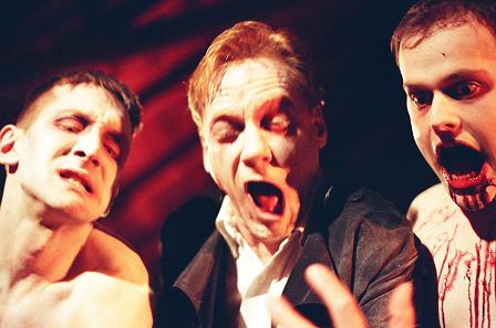 Judging by the proliferation of movies and TV shows about the blood-thirsty undead, Americans really love their vampires… and who doesn’t love a good bite on the neck by a hot guy every once in a while anyway? Patrick McGuinn’s new homoerotic horror flick, “Eulogy for a Vampire”, offers flagellation, eviscerated animals mysteriously appearing, and lots of fake blood. However, with its heavy camp elements, the film owes a bit more to the Hammer horror movies (Think 1974’s “The Satanic Rites of Dracula” with Christopher Lee, where the “blood” had the consistency and color of tempura paint.) and the sexploitation flicks of the 1970’s rather than the current onslaught of torture porn like “Saw VI” and “Antichrist”– both, interestingly, released the same weekend as this indie film. “Eulogy for a Vampire” takes place in an ivy-covered, isolated monastery in upstate New York. Despite the tranquil setting, there’s more going on at this monastery than just praying– although a lot of these guys are likely on their knees a lot. The opening piano score should be beautiful, but there’s a haunting element to it that lets us know that something sinister is in the air. When the movie opens, we meet two young monks in love– Anthony (Sal Bardo) and Florian (Ryan G. Metzger). Anthony wants sexual freedom with his brother– but Florian, true to his religious vows, doesn’t submit. Anthony murders Florian in a fit of repressed unrequited lust and locks the body in a trunk. Twenty-five years later, an older and now Father Anthony (Wilson Hand) medicates his repressed guilt with booze, while sexual tensions run amok at the monastery. In the case of Brothers Eric and Rafael (Craig Philip Lumsden and Damacio Ruiz, respectively), the tension explodes into loud man-to-man sex, which rankles prissy Brother Stefano (Nate Steinwachs). The sole occasional visitor to this cloistered clink is wise-cracking delivery boy Mr. McGee (played by comedian Shawn Hollenback). That is, until a mysterious, trashily sexy young kid with amnesia named Sebastian (Angelo Tursi) shows up. This gets the brothers’ collective hormones raging and makes Father Anthony even more crazy. Who is this stranger? Is he Satan? An embodiment of a lost soul from the past? Or just some young drifter? All we know is that mysterious things start happening: Stefano takes ill, an apparition of the murdered young Florian starts appearing in broad daylight, and many of the monks start having grisly visions followed by diabolical behavior…