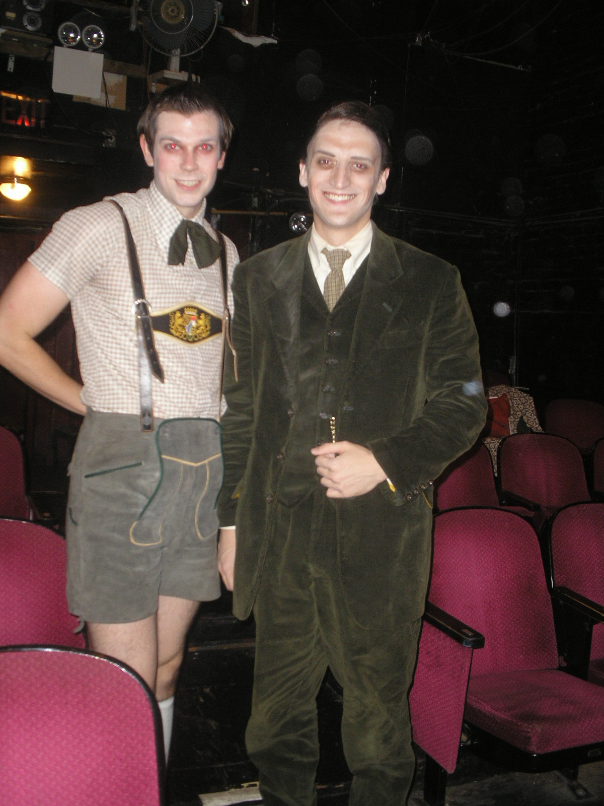 Meanwhile, the “wurst” is yet to come! Our nutso Nazis are working on their sinister second project: finding the perfect body to attach to Adolf Hitler’s head (Ryan Feyk), which has been kept alive in a jar (a la “The Brain That Wouldn’t Die”). Opportunity knocks– literally– when an pair of stranded American tourists come to stay the night: narcissistic movie star Sylvia Beasley (Jessica Caplan) and her henpecked, blandly attractive husband Paul Perrit (Eric Jaeger). Dr. Frankenstein wants Paul’s body… to attach to Hitler’s head. Her sexual appetite awakened, Anne Frankenstein also wants Paul’s body… for different reasons. In turn, Paul falls hard for the blonde Franken-tranny in what’s truly the most unorthodox love story to hit the stage in years. The plot thickens… and sickens. Will Paul leave his shrewish wife for Anne Frankenstein? Will forbidden love triumph? Will Adolph Hitler’s wretched soul rise again?