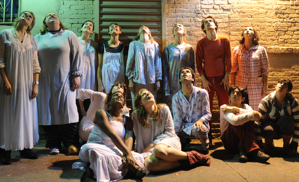 That’s part of the essence of Peter Pan: The boy, raised by fairies, who refused to grow up. The literary character who spawned three movies (A silent version in 1924, the Disney animated film in 1953, and a live-action British film in 2003), as well as frequent stage revivals and innumerable references in pop culture. At the foundation of Jeremy Bloom’s new reinterpretation of the familiar story is J.M. Barrie‘s text. Bloom is completely faithful to the author’s original literature, incorporating prose from Barrie’s 1911 work “Peter Pan and Wendy” as well as “The Little White Bird”, the 1902 adult novel where Peter Pan originally appeared. The text holds up remarkably well, including some truly riotous (judging by the audience’s reaction) dialogue where Captain Hook laments his own villainous reputation (Specifically, Hook bemoans how children never want to be Hook when they “play Peter Pan”…). The timeless words, recited by various members of the cast throughout, is bolstered by artful lighting, occasional songs and dance-like movements, and original music by The Books which plays throughout the performance. Bloom also features some renegade casting: Wendy is played by Heloise Darcq, a French actress with a thick accent to prove it. Captain Hook is portrayed by actress Joyce Miller, who gives the audience her lines with a menacingly deadpan– and often hilarious– delivery. Eschewing the traditional green tights and feathered hat that Peter Pan wore in the Disney movie (and on the peanut butter jar), Bloom’s vision of Peter wears tight red PJ’s. The entire cast, in fact, wears pajamas or nightgowns. More importantly than what they wear, however, is that the actors of this large, multi-ethnic cast are all clearly in touch (make that very, very in touch) with their child inside. Audiences will likely undergo a similar reconnection after seeing “Peter-Wendy”. The characters are pretty much the same as we remember them, as is the plot. Although two guesses won’t be necessary as to who will emerge victorious in the showdown between Peter Pan and Captain Hook, what’s less clear is Wendy’s climactic decision: Will she go with Peter to live in Neverland, or will she return home, knowing she’ll eventually have to become an adult?