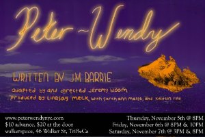 “Peter-Wendy” is playing at Walkerspace at 46 Walker Street through November 8th. Showtimes are Saturday and Sunday at 3PM and 8PM. Tickets are $20 and are available at www.BrownPaperTickets.com or at the door. Visit www.PeterWendyNYC.com for more.