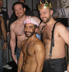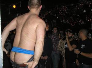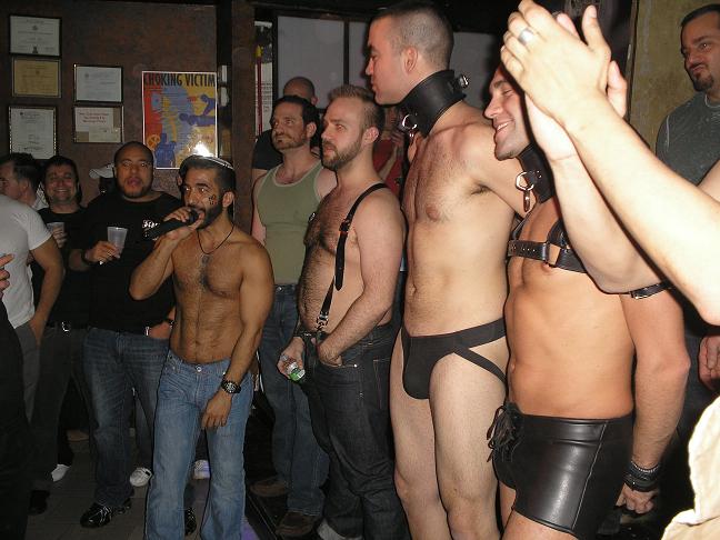 On February 1st, the popular Monday night bear/cub/otter/silver fox party “Woof!” at Chelsea’s View Bar was the site for the First Annual “Mr. Woof!” Contest. Five contestants– Ryan, Jared, Brandon, Nick, and Leo— vied for the chance to win the envied title. Hosted by porn star and promoter Mike Dreyden, the celebrity judges were well-known men-about-town Will Clark, Torez, and Jonny Mack. After the crowd was warmed up by go-go boy Ricky and worked up even more by contestants Nick (in a leather jockstrap) and Leo (in tight leather shorts) playing pool, DJ Joe X launched into Mickey Avalon’s “Stroke Me”, and each of the contestants had his turn on “the box”. The three judges then asked each of the five guys a really probing question, like “Are you a top or a bottom?” When judge Will Clark asked contestant Jared, “During sex, whose name do you frequently call out?”, his answer was… “Bruce Willis!” (Sigmund Freud, analyze that!) The audience’s enthusiasm would determine the winner, but the volume of applause between the two hairiest guys was too close to tell. So, the next step was a showdown dance-off between Ryan and Jared. The winner was Ryan Moller, who was not only had the best moves but also knew how to win the crowd– making lots of eye contact and workin’ that boyish charm with the testosterone-heavy audience. The blue jockstrap helped too. Afterward, the newly crowned Mr. Woof 2010 told me that he was nervous about his dancing; to practice, he was “watching a lot of You Tube videos”. When someone else asked First Runner Up Jared if he would ever show “the full monty”, he said absolutely not… even if it would have meant winning the contest. I asked him, “Not even for charity?” The answer was still, “No!” That’s a dirty shame… Another contestant told me that he didn’t think his pecs looked good enough in the pictures I took that night. I told him to (1) hit the gym, and (2) remember that The First Annual Mr. Rawhide Contest is on March 12th. Hint, hint!