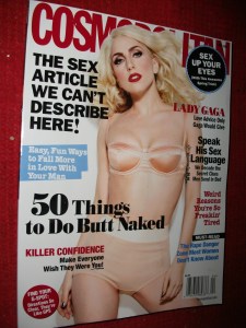 The latest woman to grace the cover of “Cosmopolitan” is 24-year old Stefani Joanne Angelina Germanotta… AKA Lady Gaga. Not many women can wear flesh-colored, hi-rise granny panties and make them look sexy… but the diva who commanded us to “Just Dance” back in 2008 and hasn’t slowed down since has proven that she can do just about anything. Inside the mag, author Christine Spines states about Gaga, “She’s kind of a genius… but she’s also kind of bizarre. Who is she, really? We plan to find out.” For starts, Ms. Gaga takes the “Cosmo Quiz”, giving her fans such revelations that that her nickname is “Gaga-loo” and that the best thing about leotards is that “you can pretend you’re Jane Fonda”. (Wow, I was really dying to know that…) But on to the dirt: What about S-E-X? The gay icon makes no bones about how she’s put finding Mr. Gaga on hold to concentrate on her career. In fact, earlier this week, our First Lady confessed that it’s been a while since she’s declared “There’s a monster in my bed!” To put it another way, she’s been… celibate! Gaga told reporters last week at MAC Cosmetics’ Viva Glam event in London, “Sex should be fun, beautiful and colorful, but women get the short end of the stick.” (Insert your “disco stick” joke here…)