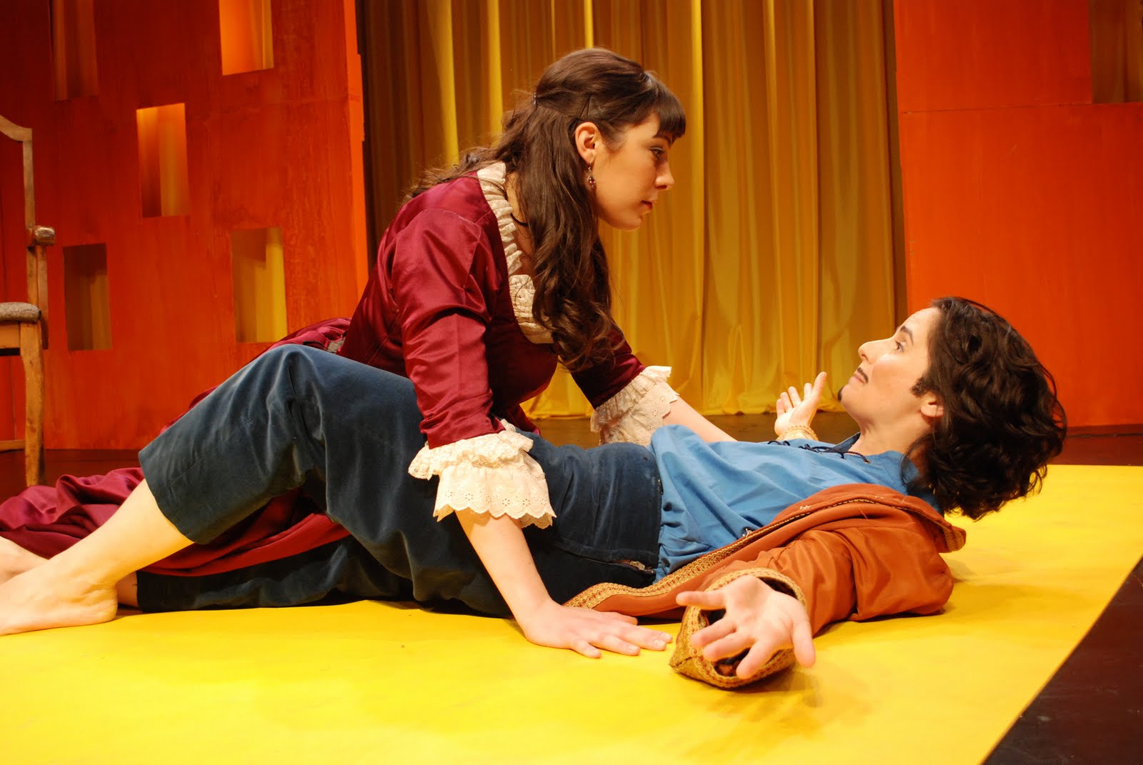 Written in 1714, Susanna Centlivre’s “The Wonder” was a big hit in England and her colonies for over 100 years, before reportedly going out of vogue in the 1800’s when British theater tastes began to change (As some have opined, not necessarily for the better!). The play even sold out performances in New York City way back in 1768. Featuring strong-willed women who dared to challenge the powers that be for control of their own destiny (romantic and otherwise), “The Wonder” was obviously considered extremely bold for its time. Once again ripe for rediscovery, Rebecca Patterson’s new version of “The Wonder” takes the play’s spirit of gender-based equality a step further: All the roles are performed by women. These are the women of the all-female theater troupe The Queens Company. For audiences in 2010, the English spoken by these characters may sound a li’l bit differ’nt from what we’re used to, ranging from merely quaint (“I had ocular proof of his ingratitude!”) to almost… well, foreign-sounding. Nevertheless, the spirit and the sass of the author’s original intentions hold up very, very well… not to mention the modern music thrown in from time to time. (Is that Tina Turner we hear?!) The play runs two hours long, but the hard-working, high-energy cast keeps it moving faster than you these red-blooded male characters can draw their swords. It’s smart, funny, and occasionally campy (One character states, “You are always gay, Colonel!” to an actress in full male drag… which prompted a hearty laugh from the audience.)