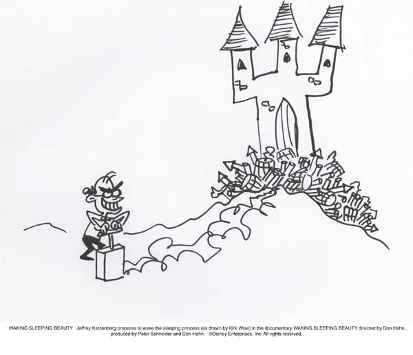 “Waking Sleeping Beauty”, a fascinating documentary about Walt Disney Studios during the years 1984 to 1994, opens with footage of Sir Elton John recording music for a certain 1994 animated film about a family of lions… which was reinvented as one of the hottest tickets on Broadway to this day. It’s hard to fathom that “The Lion King”, the movie, came out 16 years ago. For many of my generation, the Disney movies of that era (“Aladdin”, “The Little Mermaid”, and “Who Framed Roger Rabbit“) are the “new” animated classics. Like the “old” Disney classics (“Pinocchio”, “Snow White”, etc…), these movies are smart, fun flicks that both the kiddies and the adults could enjoy… as well as remember. What many may NOT remember, however, is that not too long before their string of hits, Disney’s animation studio was down Alice in Wonderland’s rabbit hole and couldn’t get out. In the mid 80’s, there was a generation gap between the old timers and the younger animators. The studio’s ambitious (and by some viewpoints, misunderstood…) 1985 PG-rated animated film “The Black Cauldron” cost $25 million to make, and was a commercial failure. Some feared that animated movies in general were on the verge of extinction: they were done by hand and were thus expensive to make, and they just weren’t bringing in the money. “Waking Sleeping Beauty” tells the story about how Disney’s animation division went from the creative and financial doldrums to become a genuine juggernaut, starting with “The Little Mermaid” in 1989. It’s a lively story, indeed, with lively players: including Roy Disney, the nephew of Walt; as well as the men brought in to shake things up: Michael Eisner, Frank Wells, and Jeffrey Katzenberg. Modernizing the studio was also part of the plan: It may seem hard to imagine, but Disney was quite resistant to the idea of using computers at first. (In case you’re dying to know, “The Rescuers Down Under” in 1990 was the first digital movie released in Hollywood.) By the time “Beauty and the Beast” was nominated for the Academy Award for “Best Picture” in 1991– the first animated film to have that honor– it was clear that something big was happening. The film lost to “Silence of the Lambs”. In the words of Don Hahn, who produced “Beauty and the Beast”, “We didn’t win that night, but we were invited to the ball.”