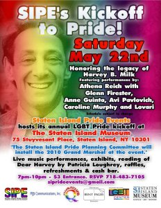 As a kickoff to Gay Pride both in their home borough, throughout New York City, and nationwide, the hardworking men and women of Staten Island Pride Events (SIPE) are presenting an event that both celebrates our pride in who we are and honors our past history. The event will honor a true pioneer and hero of modern gay history: the late San Francisco City Councilman Harvey Milk. Milk, whose life story was the basis for the critically acclaimed big-screen biopic “Milk” in 2009, was the first openly gay man ever to be voted into public office. SIPE’s Kickoff to Pride will be held at The Staten Island Museum and will feature exhibits, a reading of “Dear Harvey” by Patricia Loughrey, raffles, refreshments, a cash bar, and entertainment by Athena Reich with Glenn Firester, Lovari, Anne Guinta, Caroline Murphy, and Dr. Hyde.