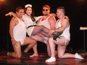 OK, I‘ll fess up. During Gay Pride Month 2010, I had my own Gloria Gaynor “I Will Survive” moment: the phenomenon where your inner diva spontaneously emerges, and you find yourself standing, posing, and dancing in your underwear in front of the mirror with a hairbrush as a mic. I wondered about the thousands of gay boys and future drag queens who must have lip-synched to Ms. Gaynor’s emblematic classic through the years. But I doubt that any one of them could top when one of those big Boys of BEARlesque, Sunshine 69, “gave birth” to MC Sparkle Southerland in a campy/queasy routine that would make cult filmmaker John Waters proud… with Ms. Gaynor’s hit blaring in the background! You could practically hear the audience collectively thinking “Oh no he DIN’T just do that!” The birthing scene was just one of the many comedic highlights of “Put a Ring on It: Bears Go Diva”, the third show by The Boys of BEARlesque. The Boys are Sunshine 69, Francois the Feltcher, and Jizzy JD (AKA JD Leggett, Mr. International Bear 2010/Mr. Metrocub NYC 2009.) JD created, choreographed, and directed the show. This installment, on Monday July 12th at NYC’ s Stonewall Inn, took the outrageousness even further than before. Oh yes, there‘s also the lone gal of the group, Sparkle, whose limber body gets tossed in the air by JD between her duties as Mistress of Ceremony. (Incidentally, Sparkle makes a much sweeter and prettier transvestite than Tim Curry.) True to its name, the show featured the music of many of our favorite divas: Tina, Beyonce, Madonna, Janet, Christina, and Donna… plus a tribute to the eternally enduring Rocky Horror Picture Show, and much more. One of the guilty pleasures of the night was the Boys‘ “Vogue”, featuring Sparkle in Madonna “Girlie Show“-era dominatrix gear. It captures the glam spirit of the original, but even Maddy didn’t have big hairy guys stripping down to jockstraps in HER video! There was no music by no Cher, although the boys do go through almost as many wardrobe changes as that diva did during her first Farewell Tour. Enjoy the costumes while they last, kids, because as you may have guessed, they usually don’t stay on for very long!