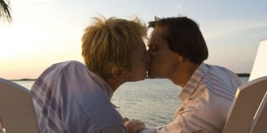 If you‘ve always fantasized about seeing funny man Jim Carrey in an explicit gay sex scene, lounging around in black mesh underwear, and sucking face with fellow actor Ewan McGregor, then your chance has finally arrived. In the based-on-fact (believe it or not) black comedy “I Love You, Phillip Morris”, Jim Carrey plays a Jim Carrey-like character named Steven Russell. When we first meet Steven, he’s a Virginia Beach cop with a pretty blonde wife (Leslie Mann) and a seemingly content life, playing the organ at his church and tucking his young daughter into bed every night. He’s also a closeted gay guy, and after surviving a near-fatal car crash, Steven leaves his simple hetero lifestyle and embraces his homo side– in a big way. Before you can sing your best Miss Ross-style “I’m coming out!”, he finds a new life in Florida, complete with a European model-type boyfriend (Rodrigo Santoro) and expensive new tastes in clothes, jewelry, nightlife, etc. He learns what many of us already know: that being gay can be costly. To finance his new jet-setting ways, Steven turns into a fraud artist extraordinaire. It’s only a matter of time before he gets busted and sent to jail. In prison, Steven falls hard for the blond, blue-eyed Phillip Morris (McGregor) of the movie’s title. It’s true love for Steven and Phillip– complete with longing stares, full-on kissing scenes, and the two men slow-dancing to Johnny Mathis’ “Chances Are“. Welcome to one of Hollywood’s most unorthodox– and definitely, most loopy– love stories.