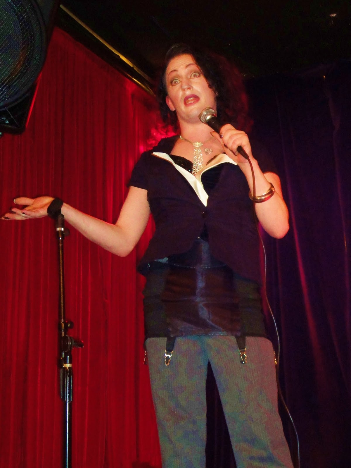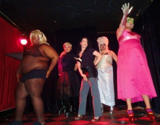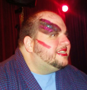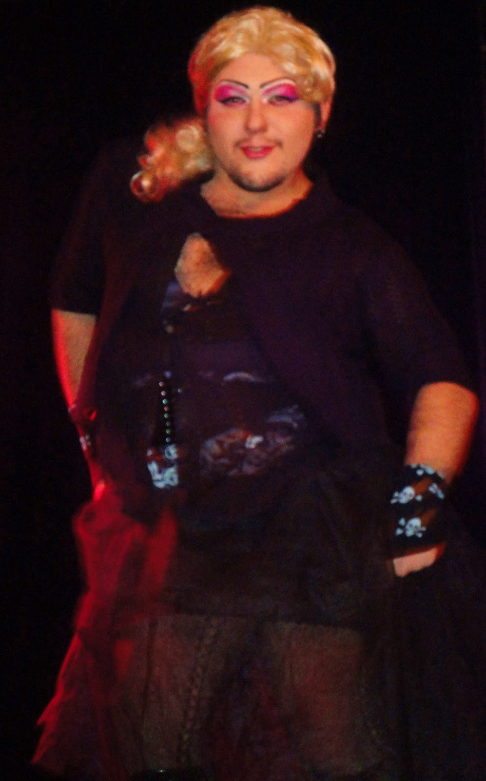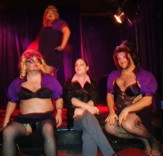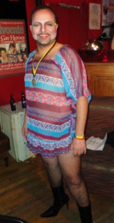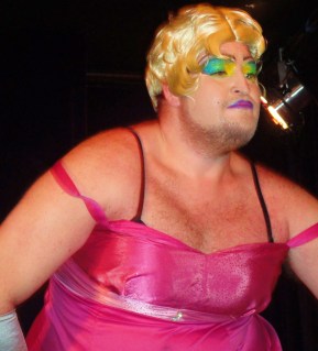This was the seventh incarnation of JD Leggett’s The Boys of BEAR-lesque, with proceeds for the night going to The Ali Forney Center, an organization which provides services for homeless GLBT youth. If seven is a lucky number, then it’s the audience who got lucky that night! Let‘s just say that with a few drinks, the Boys‘ “All That Jazz”– featuring Sunshine, JD, and CJ in brunette wigs and black lace– was guaranteed to get the straight guys (or “sorta straight” guys) rubbing their crotches… or at least questioning any deviant feelings that might be lurking in their brains. Sunshine and Sparkle played Big Barbie and Lesbian Ken for the campy 1997 hit “Barbie Girl”. And all the boys got their chance to shine on their own. As Titian-haired, plus-sized lingerie-clad diva “Tiffany” (Remember the straight guys rubbing their crotches I spoke about earlier?), CJ performed to Marilyn Manson’s simmer-and-seethe version of the ’80’s hit “Tainted Love”. (Trivia: What was the other ‘80’s hit that Manson re-did? The answer’s at the bottom…) Jay, in his BEAR-lesque debut, performed one of Tina Turner’s most underappreciated tunes, “Nutbush City Limits”. Not to be outdone, JD proved to be a very Gleeful “Sweet Transvestite”. At the risk of getting a load of angry e-mails from all the Gleeks out there, I have to say the new version is admirable… but I can’t forgive them for changing the lyric from “Transsexual Transylvania” to “Sensational Transylvania“? Arrgh! Sparkle appeared several times in “boy drag“ (Remember the genderfucking I spoke of earlier?), including as a leatherboy and as the butchest construction worker since the Village People (If you don’t get the irony in that, I can’t help you… ).