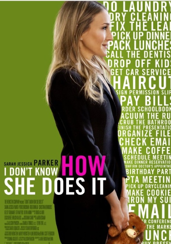 I’m joking. Of course, this movie isn’t a sequel, and Parker doesn’t play Carrie. “I Don’t Know How She Does It” is actually based on the 2002 novel by Allison Pearson. Parker (who, even when “disheveled” from multitasking, still looks as lovely as ever…) is Kate Reddy, a Sarah Jessica Parker-like Boston wife and mother of two small children who manages to play “Mama“ and still hold a demanding job as a finance executive. Kate is smart, energetic, and charismatic. However, one of unfortunate results of her demanding life is that she occasionally has a hard time meeting her own high standards. She feels “guilty” about not cooking something for her daughter’s bake sale, so she buys a pie and beats it up enough to make it look “homemade“. While her kind husband Richard (Greg Kinnear) gets ready for sex, Kate falls asleep… although later on, she is lying in bed awake, with an animated “to do list” swirling around above her head. Kate’s angst level only becomes higher when she takes on a big project requiring her to commute from Boston to New York City. While Parker‘s Kate may be suffering from stress with that commute, it allows us some nice footage of Ms. Parker strolling through the Big Apple, where she seems so “at home”.