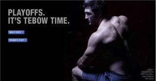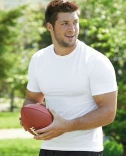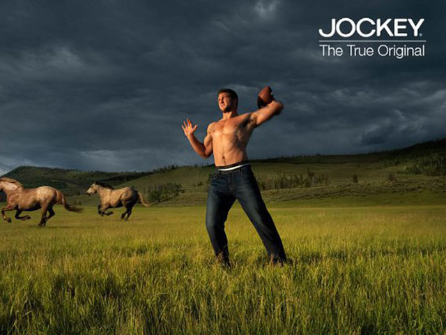 Before David Beckham strutted his stuff for Armani and for those H&M commercials, there was Boomer Esiason in his tighty whities for Hanes. (Remember that commercial? I sure do!) Before him, there was baseball’s Jim Palmer modeling in “Playgirl”-style poses for Jockey. Not to be outdone, New Zealand rugger Dan Carter also delighted hoards of admirers (most of whom have probably never even seen a rugby game) when he too modeled for Jockey. The latest athlete to sign on as spokesman for the ever-enduring underwear company is 6’3” Denver Broncos quarterback Tim Tebow. Tebow has indeed crossed the yard line from sportsman to pop culture novelty, known not just for his gridiron skills but for his blandly attractive looks, his life story, and his–shall we say, colorful behavior as well. The 24-year old, self-proclaimed “devout Christian” and reported virgin has brought the term “tebowing” (defined as: spontaneously getting on your on his knees to, ahem, pray… regardless of your surroundings.) and the “Tebow Rule” (the prohibition of football guys wearing messages on their eye black, even though that’s not exactly a new law) into our lexicon. His persona has alternately produced admiration for his faith alongside the occasional mocking by comics on late night TV. But back to the undies. Unlike sexy celebs Antonio Sabato Jr. and Mark Wahlberg, Tebow will be the first model with the distinction of NOT showing his underwear in an underwear ad. Some artfully shot photos of a shirtless, gym shorts-clad Tebow with the Jockey waistband showing did make the rounds on the net, and the first widely-seen ads showed the jockstrapper shirtless but this time tossing a football in a field, wearing jeans and with the Jockey waistband again showing. Interestingly, on the Jockey website, our Tim is now fully clothed, choosing to model the tees only. It’s like watching a reverse striptease. There’s no “official” reason for Tebow’s choice of how much (or how little) to show, but Mo Moorman, Public Relations Director for Jockey International, has stated, “Some things are better when left to the imagination.”