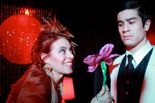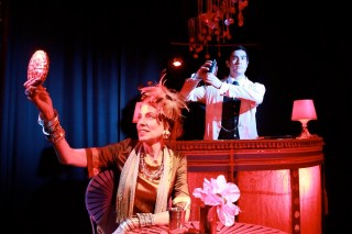 On the night I saw a preview of Tennessee Williams’ “In the Bar of a Tokyo Hotel”, The 292 Theater seated only sixteen people. There were ten chairs in the “back row“, and six plump red cushions making up the “front row”– perfect for sitting lotus style. To say that the Theater‘s faithful production of the play, running through March 31, is an “intimate experience” is a major understatement. This production is so up-close-and- personal that it even lets you see right into the eyes of all the characters. And, let it be said that these eyes speak volumes! You have the wild, “too far gone” eyes of Mark (Charles Schick), an American artist who is losing his grip on reality at full speed ahead. You have the restless, hungry, and often wickedly manipulative eyes of his sexually frustrated wife Miriam (Regina Bartkoff), who is preoccupied with plotting her escape from her unhinged husband without losing his financial support. And, you also have the eyes of the character known only as “Bar-Man” (Brandon Lim), who watches all the unfolding drama from behind the bar. Limited by his servile status in the overly structured Japanese society of the time, this character is severely restricted in what he can say, even when he‘s having his crotched grabbed by Miriam or having drinks spilled all over the stage by the tremulous Mark. Like Bar-Man, the audience gets a magnified, almost voyeuristic view of all the highly emotional goings-on.
