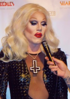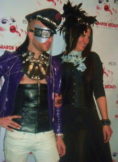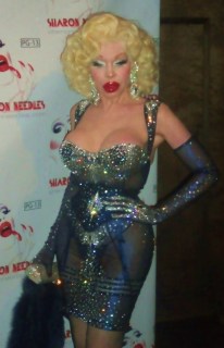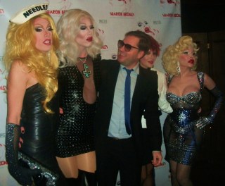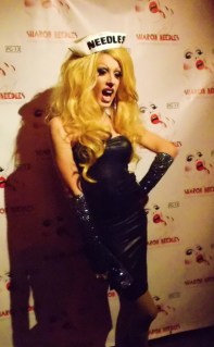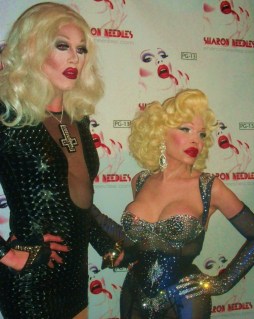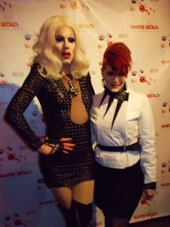 The “abandoned” McKittrick Hotel is the venue where mindfuck of a theater piece “Sleep No More” is playing, and the now “newly restored” hotel’s combo of dark corners, ominous stairways, and Grand Guignol-meets-film noir atmosphere was perfect for Needles’ deliriously demented persona. This is, after all, a girl whose songs include “Dead Girls Never Say No”, “Call Me on the Ouija Board”, and “Dressed To Kill”. That night, the hotel ballroom was wall-to-wall with a wide variety of Needles’ loyal minions (I don’t know if there’s a term yet for Sharon’s fans. “Needleheads” just doesn’t cut it…). They included the cast and crew from her new video and upcoming documentary; “RuPaul’s Drag Race” groupies (and there were MANY!); and a new generation of young New York City creatures of the night. The audience got to see the video for “This Club Is a Haunted House” (filmed at the McKittrick Hotel, by the way…) as well as clips from the upcoming documentary “Sharon Needles: Parental Guidance”. In full goth glam and with her famously unapologetic sense of humor on hand, the statuesque scream queen met with the press before it was time for the money shot: a live show. As we learned in clips from Needles’ upcoming documentary, America’s new drag sweetheart feels very passionate about honoring the genderfucking celebrities who paved the way before her: including Divine, Candy Darling, and Jayne County. Another is Amanda Lepore, the transgendered socialite with the famous gravity-defying breasts who is an omnipresence at every red carpet event. Indeed, Lepore is paid tribute to in one of Needles’ new songs, the unambiguously-named “I Wish I Were Amanda Lepore”. She joined Needles on stage for that one. Another song was the simmering, seething “Every Day is Halloween”, prompting one audience member to declare, “She’s the new Manson!” The song, released on Halloween day last year, was dedicated to “everyone who ever got picked on, and survived, and turned into a fucking Supergirl!”