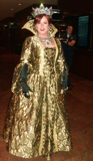 The last musical act before the coronation was Daniel Patrick Ellis, and then it was time for The Big Moment, which traditionally takes place at midnight. For her Coronation, incoming Emperor XXII Wen-D Bouvier Pinkhouse, The Rock ‘n’ Roll Emperor of Peace, Love, Unity and Respect, assembled a menagerie of her friends featured as hilariously over-the-top icons of music throughout the decades (Janis, Dolly, Tina, Stevie Wonder, and MANY more), with herself decked out as a fuscia-haired, sequined Elvis. The act concluded with Alicia Keys blaring, “This girl is on fire!” How appropriate! The new Empress XXVII Gracie Steeles, The Stiletto Heeled Jersey Girl Empress, had a more traditional but no less moving wedding-style procession, with her friends preceding her down the aisle, some dressed in matching bridesmaid-style gowns. Her walk concluded with the enduring fairy tale lyric, “When you wish upon a star…”. Again, it was highly appropriate. Later, I asked the new Emperor what her plans were for the year, starting with Sunday morning. She answered, “Tomorrow, we have a brunch at Lips, where I give out awards to some people, and we celebrate the beginning of our reign… and also the outgoing Monarchs also give out some awards to people too. We’re gonna have a good time. We’re rolling! We have a lot of events to do all year long, and we have a lot of things planned. I’m very excited We’re reaching out to LGBTQ youth, as well as the aged. We’re gonna be very hands-on this year, getting out in the streets and working with kids and stuff. We are very devoted!”