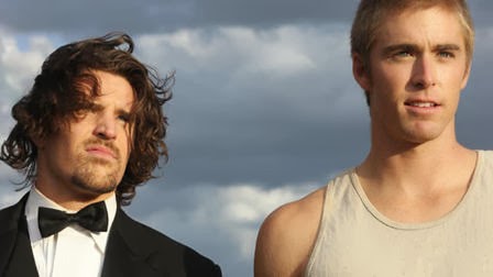 Meet the two men of the new-to-DVD erotic drama “Capital Games”: Steve Miller and Marc Richfield.  Steve (Eric Presnall) is a former LAPD officer who traded his badge and nightstick for a career in advertising.  He’s handsome, he’s blond, and he apparently likes to work hard and play just as hard.  Mark (Gregor Cosgrove) is an equally easy-on-the-eyes Brit with a killer accent (Expect to hear a lot of “bloody’s” when he speaks…) and killer sense of style.  Mark is the flashy new man at the company.  When the two first meet, it’s not exactly love (or even “like“) at first sight: Mark steals Steve’s parking spot, and the their subsequent encounters in the competitive world of advertising quickly become a testosterone-fueled pissing contest.  Like two rival peacocks, the two men’s mutual vanities are always on the verge of colliding. Steve is a no-nonsense alpha male, and Mark is alternately seductive, snarky, and tempestuous with Steve.  A big shift in their relationship, however, occurs when their company goes on a so-called “team-building retreat” over the weekend in the hot California desert.  The two men find themselves accidentally stranded alone and lost, desperately seeking to stay warm when the temperature drops drastically at night. Hmmm…