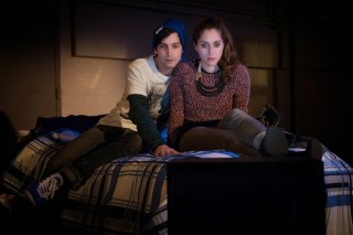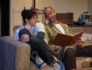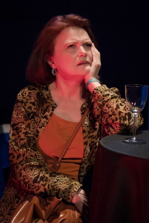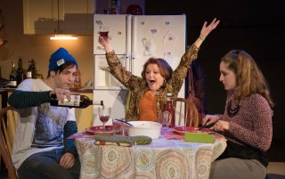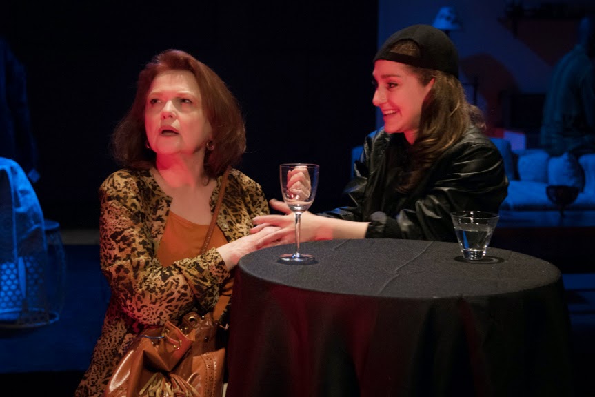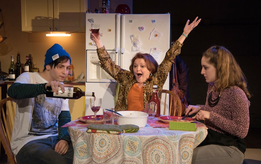 There IS a fifth character in “Leave Me Green”, who never actually appears on stage: Inez, Rebecca’s deceased life partner and committed second mother to Gus. Although we never see Inez, she is animated by the onstage characters’ vivid recollections of her– and it’s not difficult to see why the passing of this larger-than-life personality was so devastating for Rebecca and Gus. The fact that Inez “comes back to life” for the audience so convincingly is only one example of the play’s smart script and excellent acting. That excellent acting includes the performances of the two younger cast members, combined with the non-patronizing dialouge that DeHaas gives them to say. It can be challenging for any young actor to convincingly portray that angsty period between childhood and adulthood, when culture at large often underestimates just how knowing and sensitive modern teens really are. The scenes between Cabrera’s Gus and Meltzer’s Lia, as budding lovers, are particularly realistic. Being teenagers, their characters are also able to see some of their society’s so-called “issues” with a more basic and unbiased eye, unblemished by the political or cultural influences of the day. “Leave It Green” takes place during the tense era of California’s Proposition 8, when legal recognition of same sex marriages was the “hot issue” of the day (Astonishingly, in 2015, it STILL is…) . Yet Gus, who was raised by two loving moms, looks at the issue with the so-simple-that-we-often-miss-it attitude of “Who cares?”– the same feeling embraced by so many of the younger generation today. When he tells his mother, “Maybe if you two had gotten married, she wouldn’t have left!” and Rebecca answers, “It’s not even legal.“, his retort is just “So?!” Another amusing yet searingly poignant scene comes when Rebecca makes a late night run to a lesbian bar. She is discovered by a wide-eyed, impressed young fan (also played by Meltzer) who recognizes her from her brief glory days as a soap opera star… when the actress was actually able to afford a cab. Throughout the play, we are frequently treated to Rebecca’s alcohol-fueled, often public episodes of grandiosity. They start out amusing, then become tedious, and then finally turn pathetic. But during the bar scene, Booker as Rebecca shows even more talent with the enviable skill of “wordless acting”. The look on her face as her selfie-minded admirer rattles on speaks volumes. Interestingly, the plays’ climactic underlying secrets are revealed when Rebecca is… sober!