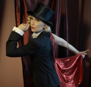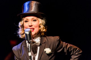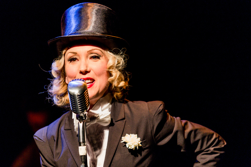 When Mad Jenny makes her first appearance in “Love und Greed”, she makes quite an impression before she even sings a single note of English or German. Our heroine appears on stage in full Marlene Deitreich-inspired androgynous glam: a top hat and full tuxedo, with her flaxen hair illuminating her face like her own personal spotlight. And, Jenny makes the tribute complete by giving a lucky gal a kiss on the cheek on her way to center stage… never letting go of her drink the entire time! This was, as you may have realized by now, inspired by the scene immortalized in Dietrich’s film “Morocco”, which shocked and titillated movie audiences in 1930. Being 2016, the audience at NYC’s famous venue Dixon Place wasn’t so shocked this time around… but they were indeed titillated! There was much more titillation to come…