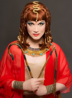 From the celebrated persona to the eye-popping costumes and headdresses, Cleopatra is a juicy role indeed– and it’s a role that Busch tells me he’s been preparing to play since he was 8 years old (!). It started when he first saw a photo of Ms. Taylor in Cleopatra-style eye makeup in a movie magazine, which led to a lifetime of fascination with (and inspiration from) a more glamorous era. Busch tells me, “I’ve been researching my roles since I was six years old. It’s not like I had three weeks to learn a female character and asked, ‘How do I do that? Maybe I’ll watch an old movie!’ I’ve been absorbing the postures, the vocal inflections, the images, and the way these actresses turn their head toward the light. I try to visit their thought processes, and analyze why they are making that acting choice– not just imitating that choice. Sometimes it’s helpful to know what was going on in their lives that made them respond to a scene in that way. There are a lot things that go into it: a lifetime of study, and a lifetime of empathy for a certain kind of actress.” He adds, “I never wanted to be a woman, but there many were times when I wanted to be an actress. As an androgynous man, I identified more with the female characters in the movies. It’s a lifetime fascination with actresses, many of whom I never actually saw. I’m as much interested in theater history as I am in film history. As a kid, I was pouring over these big coffee-table style photo books of stars of the American stage and being as fascinated by a photograph of, let’s say, actress Katharine Cornell— who did not appear in films– as much as I’d be fascinated by a photograph of Greta Garbo. In a way, the great ladies of theater, who I could not see, stimulated my imagination even more– because I could create what their performances were in my head. They are as much an inspiration to me as movie actresses.”