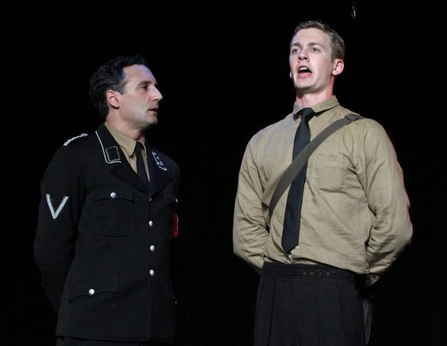 The play’s central character is “the perfect picture of Aryan youth”, the tall and blond Rolfe Gruber (Logan Sutherland). “Sound of Music” fans remember Rolfe as the love interest of the oldest Von Trapp daughter Liesl. Not a boy but not yet a man, Rolfe is “17 going on 18”. Rolfe, however, isn’t romantically interested in Liesl. He’s carrying on a discreet love affair with a handsome, free-thinking university student named Johan (Alex J. Gould), who’s also a Communist. In an Austria on the verge of The Anschluss (annexation by Nazi Germany), this was a forbidden romance. Rolfe is facing a seduction of a very different kind by the power-hungry, propaganda-spouting Herr Zeller (Dominic Comperatore). Zeller is pressuring Rolfe into wooing Liesl, in the hopes of getting more knowledge about her father Captain von Trapp– a person of interest in Berlin. He also instructs Rolfe to watch out for “deviants”, telling him: “I must warn you: A handsome man like you will attract the– how shall I say?– the advances of a particular type of adult male whose interest in you is of an unhealthy nature. These men are deviants. Diseased. They corrupt from within. They need to be rooted out and eliminated. Do you understand?” Zeller promises Rolfe power and status within the Nazi Party as a reward. Conflicted about his own sexuality and also looking for some kind of “purpose” in his life, our Rolfe is torn.