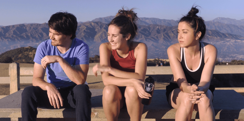 The first people we meet in Victor Neumark’s bold, intelligent, and often very funny debut feature First Blush are Nena (Rachel Alig) and Drew (Ryan Caraway). They are a young, easy-on-the-eyes married couple living in Los Angeles’ trendy and picturesque Silver Lake area. It’s Nena’s 30th birthday, and Drew has helped to plan a surprise party for his wife at the home of their friends: the motor-mouthed Carrie (Jordan Kopanski) and her fiance John (Christopher Moaney-Lawson) — who’s conversely, well… a man of few words. Although Drew winds up ruining the surprise element of the celebration, Nena still unwraps an unexpected present on her first night as a thirty-something. At the party, the birthday girl’s eyes meet up with those of Olivia (Kate Beecroft), a charismatic, 25-year old beauty who’s a co-worker of Carrie. (Intentionally or not, Alig and Beecroft look enough alike to play sisters, although the quickly established personalities of their characters are as different as can be.) The attraction between the two women is instant, and a subsequent camping trip with five adults and two tents (Figure it out…) leads to a fast friendship between Nena, Drew, and Olivia. Seemingly before you can say “menage a trois”, there’s a “first date” complete with jitters, sexual exploration, and Olivia moving in with the married couple.