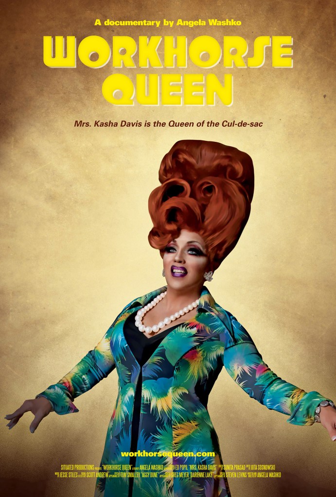 In the opening credits of Angela Washko’s brilliant documentary Workhorse Queen, the audience is treated to a montage of scenes from the busy life of drag star Mrs. Kasha Davis. We see the big-haired queen recording fan messages for Cameo, rehearsing a new routine, trying on a pair of boobs, and appearing on the red carpet for a photo opp. Soon afterwards in the film, we also get to watch the hilarious video that ultimately transported this beloved upstate New York performer into the international spotlight: Mrs. Davis’ triumphant audition tape for RuPaul’s Drag Race…