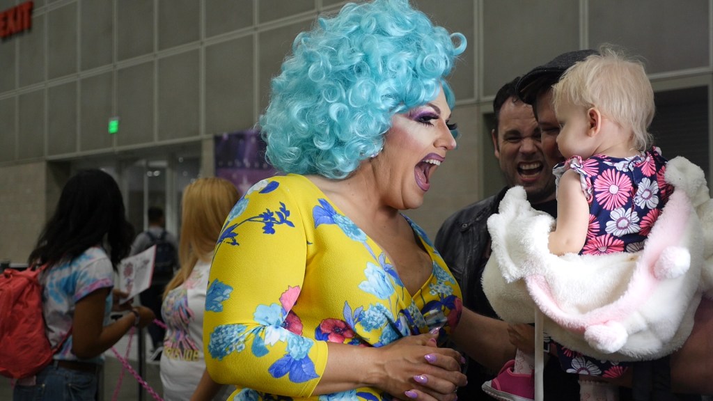 As die-hard or even just casual fans of Drag Race already know, every queen has a story. With the many, many, MANY colorful personalities competing for an envied spot on that iconic TV show, that makes for a seemingly infinite number of drag tales. But no one can argue that the Mrs. Kasha Davis has an especially unique story to tell. Mrs. Davis was already a popular performer in the tight-knit drag scene of Rochester, a city 347 miles from Manhattan. As the audience learns in Workhorse Queen, pre-pandemic Rochester enjoyed a thriving drag culture, which one interviewee mirthfully credits to something in the water: “mostly chemicals from Kodak!”. Mrs. Kasha Davis’ unique “shtick” was her persona of the suburban housewife with an affinity for top shelf treats: Davis is single-handedly responsible for cementing “There’s always time for a cocktail!” into our pop culture lexicon. Underneath the makeup, Mrs. Kasha Davis is Edward Popil, a suburbanite who is happily married to a supportive husband (Steven Levins, AKA “Mr. Davis”), a step-parent to two girls, and a doggie daddy as well. Popil/Davis auditioned for every single season of RuPaul’s show for years. In 2015, the persistence finally paid off when the hot-to-trot housewife finally got called to be a Contestant on the seventh season of RPDR— at age 43. (The title of the movie, FYI, comes from the impromptu label that Guest Judge Isaac Mizrahi gave to her…)
