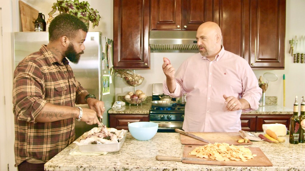 JB: I was standing there realizing, “OK, I don’t know who any of these people are, or what their views are.” It’s DC, but there’s still some diversity of opinion here. I thought, “Is Jason my husband? My partner? My roommate?” This was the first time I had been so aware of being gay and of having to come out in a long time. I thought about it for three weeks. It finally hit me, being the storyteller and connecting the people in the way that I wanted to, to shut off my brain and open up my heart and mouth– and then to just let it spill. If I got up there every single time and thought, “What am I calling Jason this time?” or “Was this person in the audience when I called him something different the last time?”, then I was never going to be good at what I do. I look at so many people in entertainment, and they create these personal brands that are not who they are. I know why that happens. I’m not saying that to put anyone else down. But I wanted a brand where if somebody walked through my front door on Tuesday night at 6 o’clock or any other time for that matter, they would go, “Yup. This is exactly who they told me he was! No surprises here.” Friends and family have confirmed that over the years. But the heart of the show is: This is really the food that I cook.. People in the room have eaten these dishes before. People at the demos have seen me tell these stories and talk about these techniques. My nine guests on the show are the first nine people who I asked. I had a relationship with all of them. And, over the last two years, since we filmed, those relationships have only grown stronger.