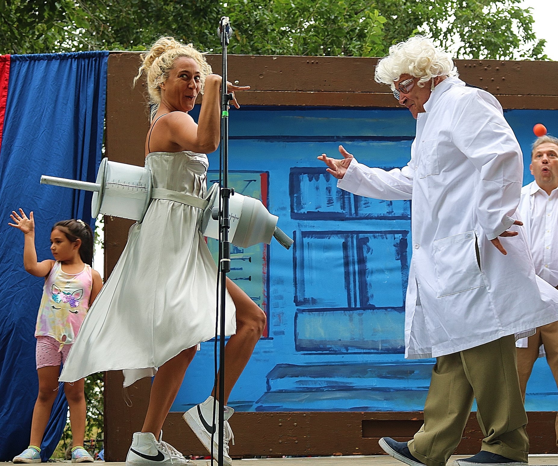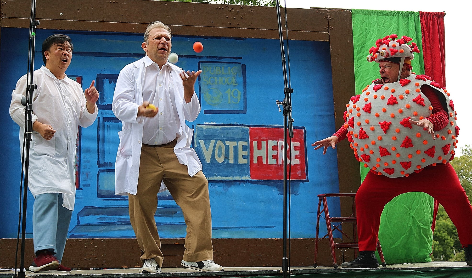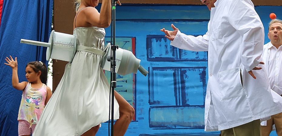 It’s not long, however, before the neophyte caregiver Flora and the entire nursing home staff are challenged by an unwanted visitor: COVID -19, played by T. Scott Lilly as a pugnacious, hot-headed blowhard (Let’s just say that orange makeup would have made the look complete…) Patients start to surrender, but the staff puts up a good fight. There’s also backup support from a clown from the “Big Apple Circus Clown Care Unit” (Terry Lee King) who challenges the virus’ buffoonery and rallies under-represented people from all aspects of NYC life to join the battle. Ultimately, however, the best chance of hope comes in the form of… (drumroll please) a vaccine, personified on stage by Danielle Aziza as “Lady Hypodermic”! Will there be a happy ending– or, at least, a chance for a new chapter with a positive outlook? Will Flora Martinez finally realize her dream of becoming a nurse?