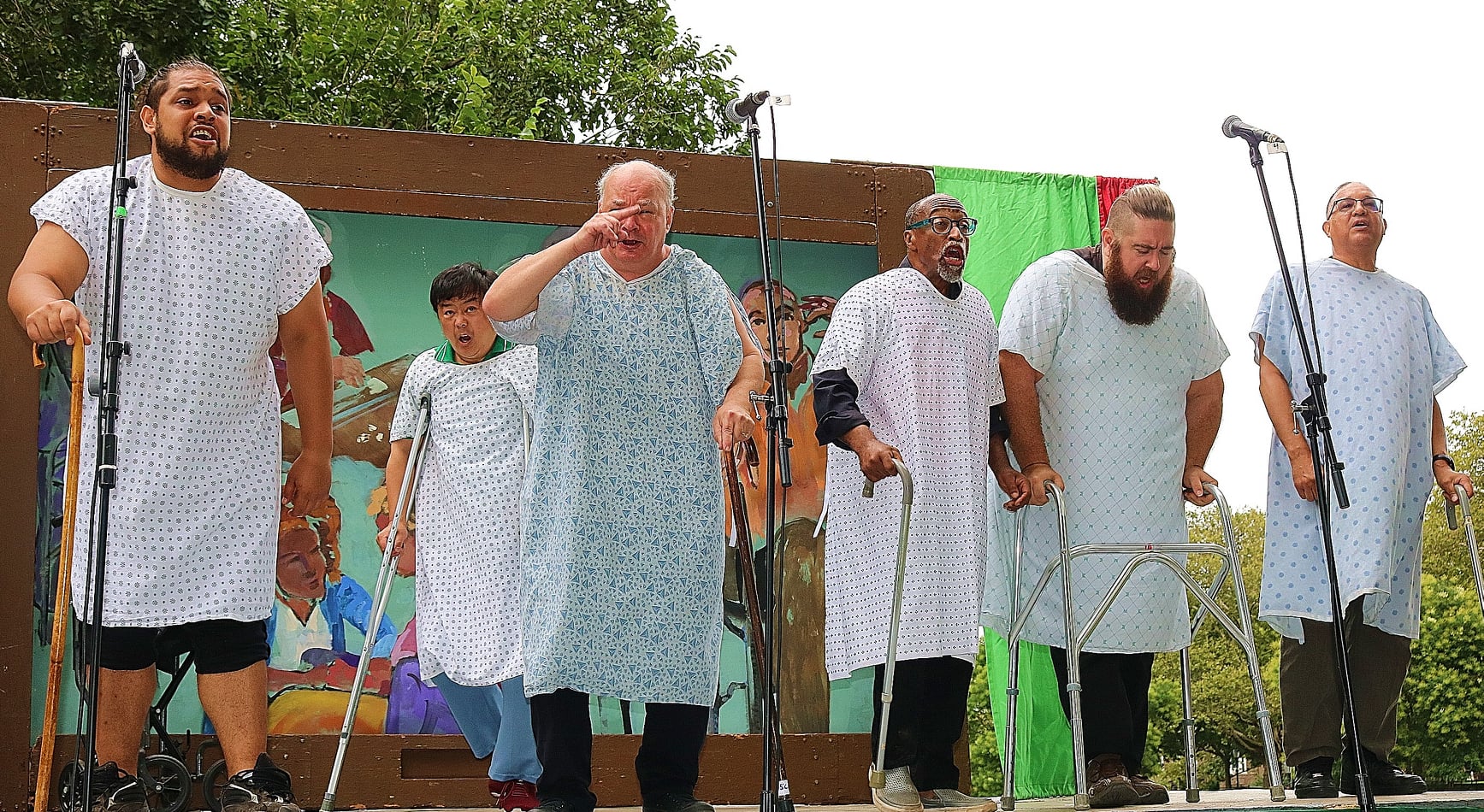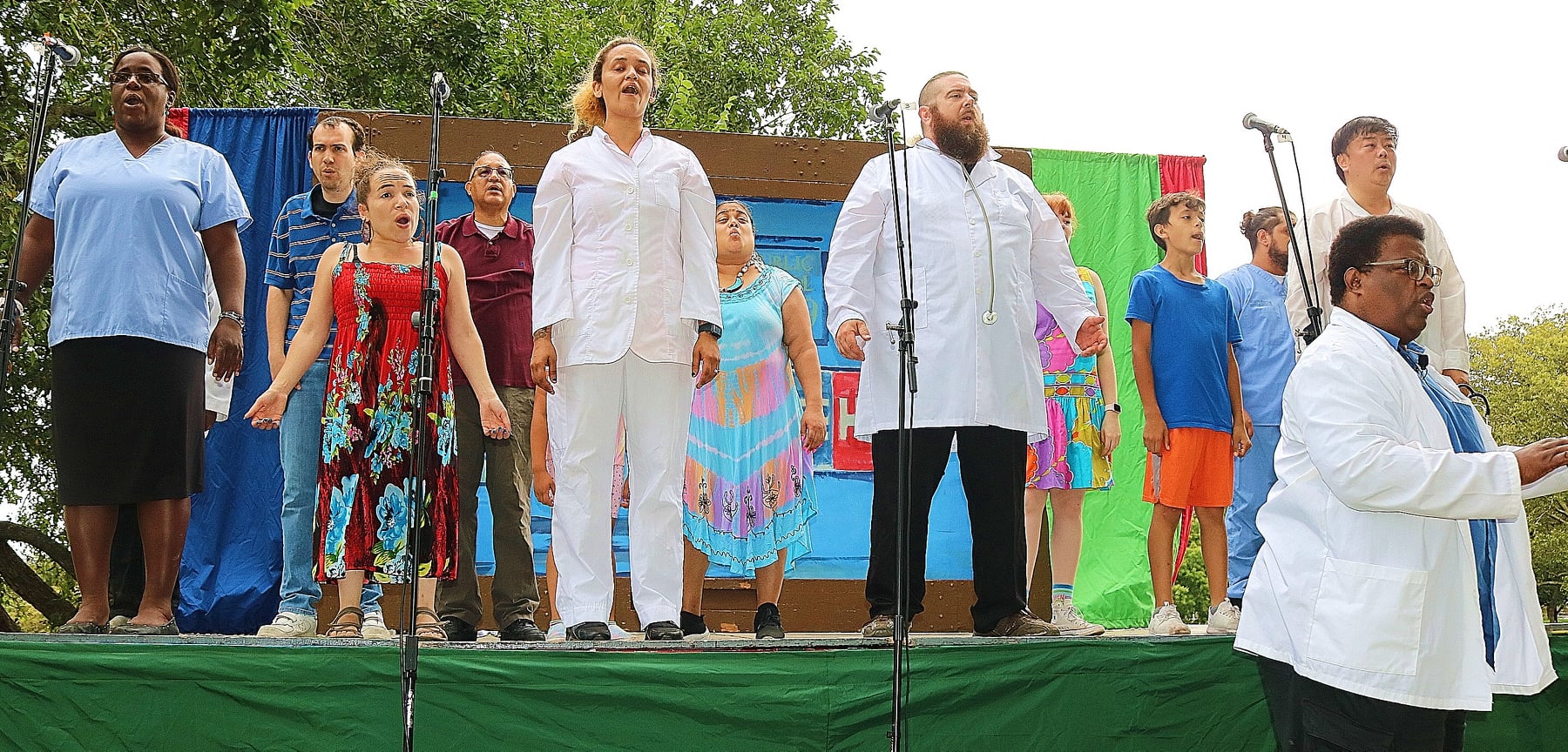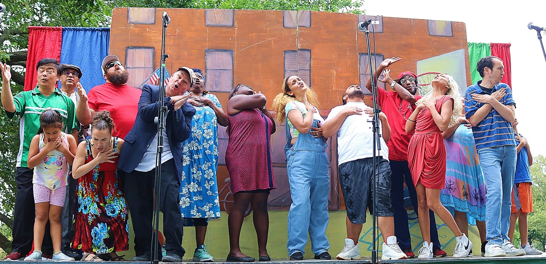 Theater for the New City (TNC)’s new musical Critical Care, or Rehearsals For a Nurse, was patently conceived to be performed at assorted outdoor spaces in all five boroughs of New York City during the summer of 2021. The “takin’ it to the streets” plan couldn’t be more appropriate, because this delightful piece– in addition to being humorous, provocative, and culturally significant on many levels — is truly a love letter to our beloved hometown, written in an infinite variety of multi-colored inks. Everything about Critical Care, or Rehearsals For a Nurse feels affectionately authentic, from the large, diverse cast to the lyrics in songs like NYCHA Housing (Yes, there IS a song called NYCHA Housing!):
