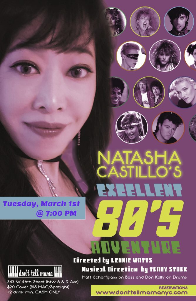 A popular and well-respected artist on the New York City cabaret scene, Natasha Castillo is a singer, composer, producer, and Award-nominated emcee. She’s also, as audiences learned on Tuesday, March 3 at the cabaret hotspot Don’t Tell Mama, a proud child of the 80’s! During her high-spirited, funny, and oh-so-nostalgic show Natasha Castillo’s Excellent 80’s Adventure, the delightful performer shared some of the reasons why the ’80’s were so “huge” for her. Her family moved from Taiwan to Brooklyn. She sang her first solo at PS 272. And… she became a teenager! (Castillo’s performance of the teen girl feminist anthem Girls Just Want To Have Fun, with her unique creative touches, was truly hilarious.) From the glowsticks that decorated the tables at Don’t Tell Mama, to Nastasha’s “Madonna’s Lucky Star era”- inspired wardrobe (More about Madonna later…), the nostalgia in the room was palpable. And then, of course, there was Castillo’s seemingly infinite collection of hot tracks, from a medley of the ’80’s many one-hit wonders, to a threesome of movie music gems (The three “F”‘s: Flashdance, Fame, and Footloose). There was even an unsung hero of a love song thrown in: the underheard heartstring-tugger Two Less Lonely People in the World by Air Supply. Natasha Castillo’s Excellent ’80’s Adventure was directed by Lennie Watts and featured musical direction by Tracy Stark.