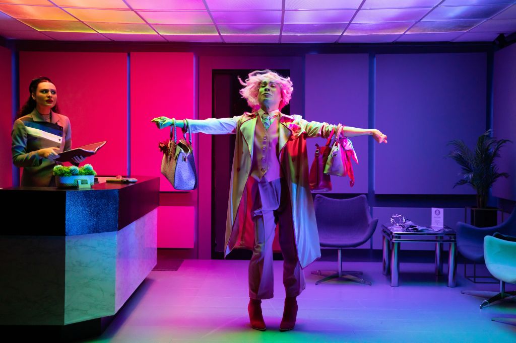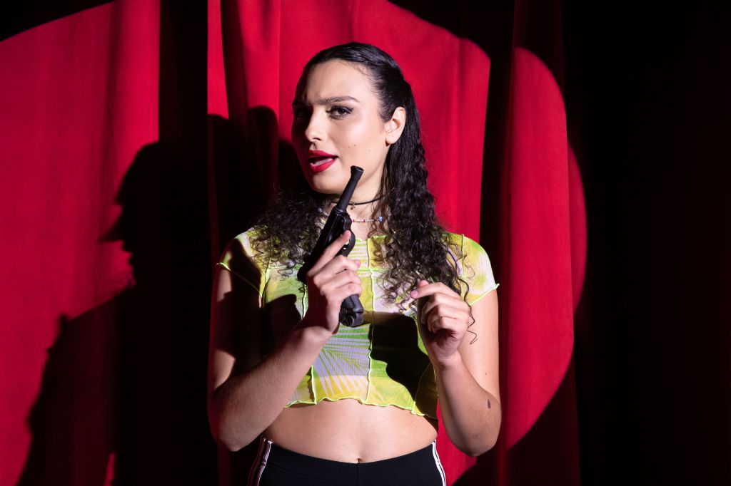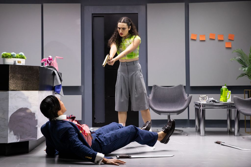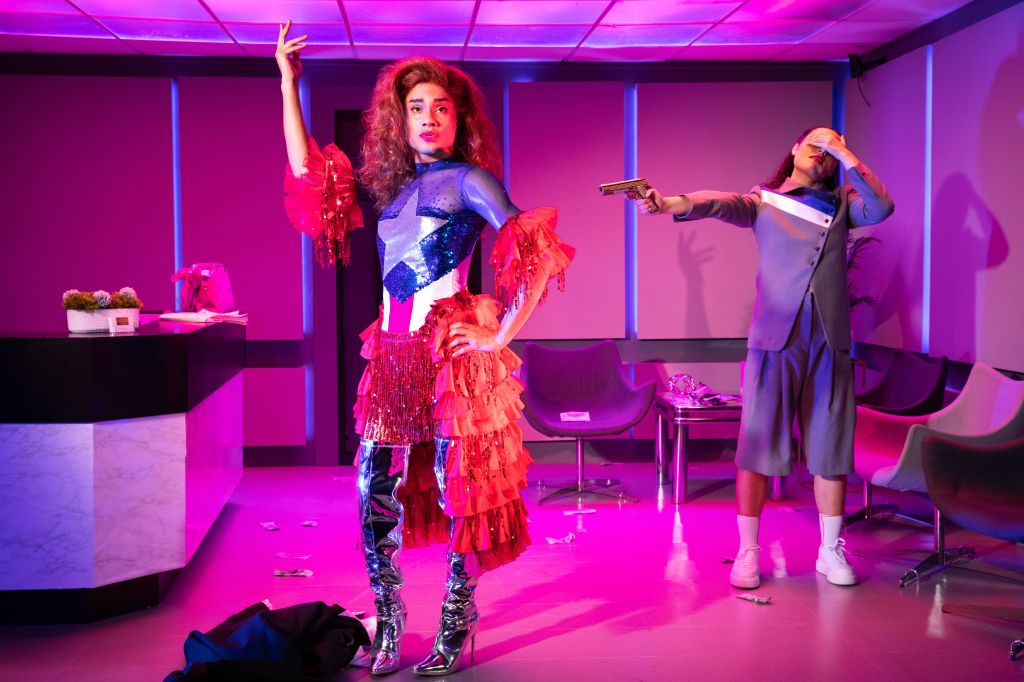The first of the two characters we meet are Lolita (Christine Carmela Herrero), a no-nonsense transwoman who introduces herself to the audience at the start of the piece. We learn that her father was a staunch advocate for Puerto Rican independence. Now living in New York City, Lolita is on an ambitious mission: To decolonize Puerto Rico from the wrath of U.S. imperialism. Lolita has a specific target in mind: The Puerto Rico Oversight, Management, and Economic Stability Act (PROMESA), a federal law enacted in 2016 which was ostensibly created to combat the Puerto Rican government-debt crisis. This included a “Fiscal Control Board” which was not elected by the Puerto Rican people themselves. Since 2016, many have theorized that the Act has done little more than to ensure prolonged colonial status on the island, as well as to foster the same economic problems that presumably motivated PROMESA in the first place. True to the play’s title, our Lolita finds herself at the swanky Wall Street offices of PROMESA, “pistola” in hand and ready to use it. She is discovered by a highly animated office worker (Samora La Perdida), who describes themself as “a Nuyorican from the Bronx with limited Spanish”. From the beginning, La Perdida establishes themself as an actor with excellent comedic timing; the audience is promised that there’s far more spark underneath that suit than meets the eye. That promise is fulfilled, for this character reveals early on that their true passion is… the art of drag. Surely enough, the first of the play’s fantasy sequences involve Board member Andrew Biggs becoming “Andrea Baggs”, with a cotton candy colored wig and wardrobe to match. (The British accent is no doubt a symbolic “wink” to Great Britian’s historical role in worldwide colonialism, which the character of Andrea seems to take about as seriously as a day of shopping.) This spicy performance is just the beginning, however: The audience is treated to masc and fem drag versions of PROMESA’s Board members, with fantastic costumes and wigs accessorized by our favorite pop tunes. (In a bold move, the Board members’ real names and VERY telling real biographies are used, although you can bet that their “real life” personas could never be as fabulous as their fantasy counterparts!) As Lolita and the unnamed receptionist form an idiosyncratic bond, Lolita grapples with just HOW to fulfill her mission. Or should she just walk away? She engages with all the fantasized versions of Puerto Rico’s self-proclaimed power players and even talks to G*d at one point, who has seemingly given up some of Their power thanks to free will. Many issues come up in Notes on Killing, including but by no means limited to economic opportunism, religion, Puerto Rican statehood, and gender identity. References to “Transricans” and “Diasporicans” are made. I’m going to be bold enough to say that Mara Vélez Meléndez’ Notes on Killing, in fact, reveals more about the heart and soul of Puerto Rican people than a years’ worth of news articles– which is, unfortunately, usually the only way many mainland Americans know anything about the island. The receptionist also comes to their own personal revolution of sorts by the conclusion of Notes on Killing, reinforcing one of the statements made in Vélez Meléndez’ script: “The journey to decolonization starts with YOU!”