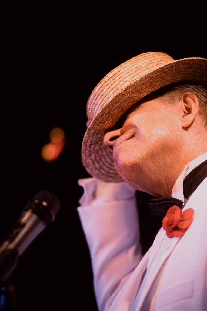 They Call Me Cuban Pete opens with Bolero in the persona of Arnaz in, shall we say, the “evening” of his life. Now elderly and frail, he proclaims, “When I close my eyes, I can still hear the music!” Before Bolero-as-Arnaz can ask the audience, “What are you all doing in my dream?”, the music progresses from a few haunting, sparse notes to the lively, robust, and fiery soundtrack of Arnaz’ home country. Bolero’s drab trench coat was soon shed to reveal Arnaz’ signature white tuxedo as he broke into the frenetic El Cubanchero. Like Bolero’s Arnaz, the audience was also transported back into time, thanks to the transcendent power of music. And what music it was! Desi Arnaz’ appeal was largely based on the performer’s ability to balance (1) the authenticity of Cuban music with (2) appealing to the so-called “mainstream” American tastes of the time. But of course, audiences both in the ’40’s and 50’s, as well as in 2022, loved the novelty songs like the delightful She Could Shake The Maracas from the Broadway musical Too Many Girls. Who could resist lyrics like: