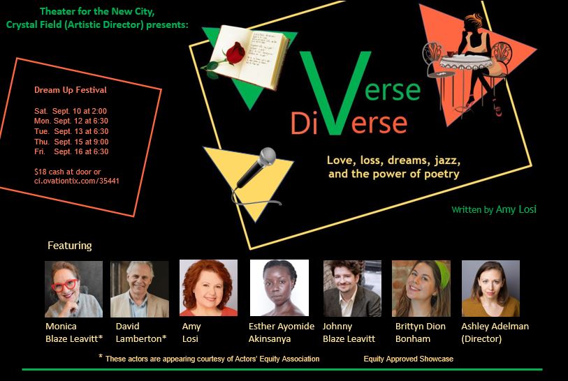 Verse DiVerse continues its world premiere at Theater for the New City, as part of the Dream Up Festival. The play continues Monday September 12, at 6:30, Tuesday September 13 at 6:30, Thursday September 15 at 9:00, and Friday September 16 at 6:30. The Stage Manager is Alexandria Thomas, and the Technical Director is Ken Coughlin. Tickets are available at AudienceView Professional (ovationtix.com)