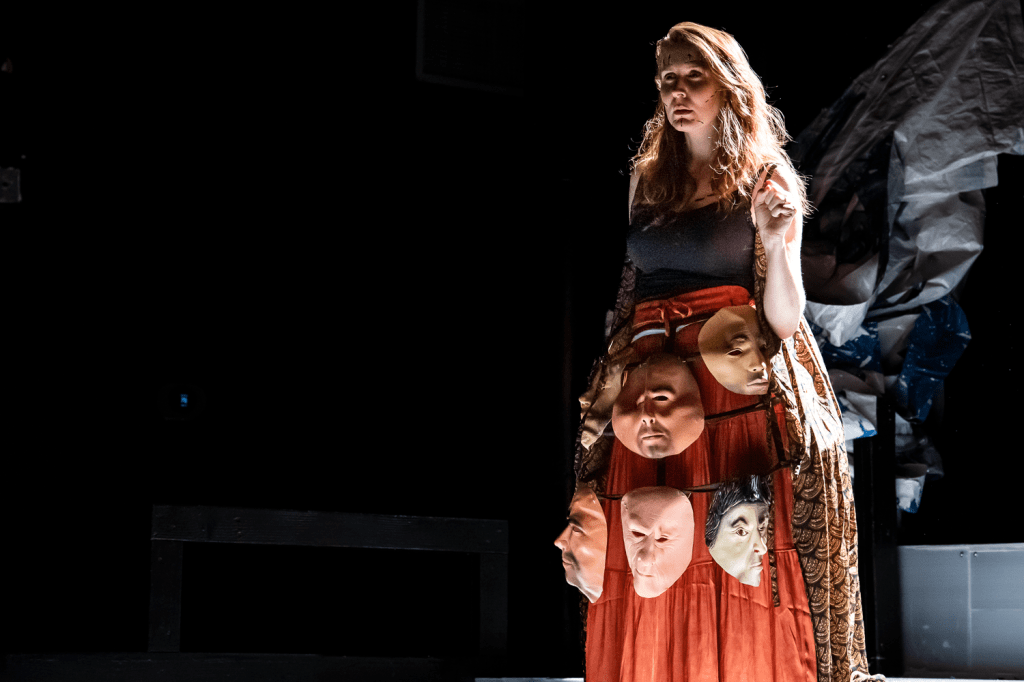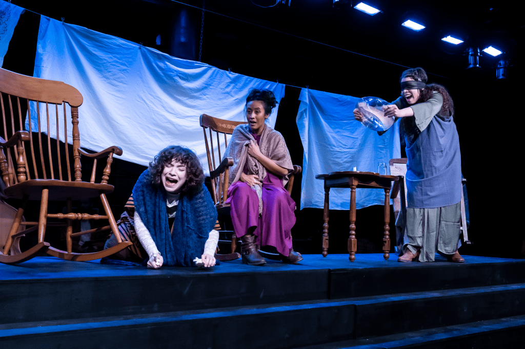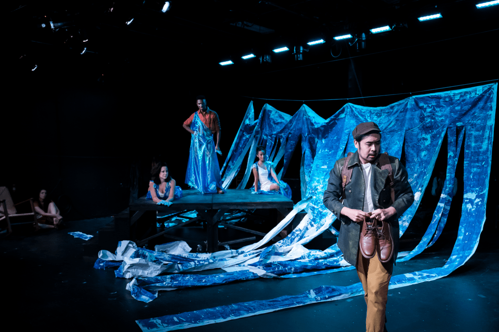 While the spotlight on Echidna clearly “dances” with some heavy themes (implied rape and incest, nonconsensual BDSM; Later on, the play also gives some allusions to gun culture and mob mentality.), the segment “Catch and the Sirens” has a generous serving of humor and camp, largely thanks to the comedic skills of the Sirens themselves. In Greek mythology, The Sirens were birdlike creatures who lured sailors to destruction by the sweetness of their song. In this retelling, an ambitious yet weary soldier named Catch (Philip Estrera) comes across the trio of warblers while crossing the river into California. The Sirens in this version (Allison Kelly, Adam Boggs McDonald, and Rheanna Atendido) are less manipulative and (SPOILER ALERT…!) are more physical embodiments of pre-determined destiny. Of course, there’s also musical number! The audience, like Catch, will be seduced.