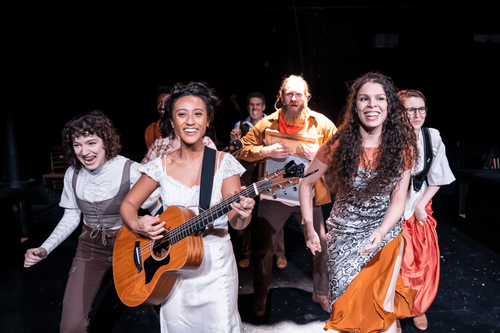 Well, for stars, it is evident that this young, diverse ensemble cast of nine works very well together, and are clearly having fun in the process. Intentionally or not, the mood throughout the show– even with some heavy subjects explored along the way– is very much in the spirit of a bona fide, old-fashioned open air gathering, with equal parts storytelling and music. The show’s opening number, Carousel, has the cast singing a capella in perfect harmony. All throughout, the singing is adorned by some instruments that are only rarely seen today in live theater (the fiddle, the clarinet, the dulcimer… And of course, given the setting, there IS a banjo later on.) Fireflies, performed later on in the show, is another delightful example of the combined vocal talents of the cast. The show also gets to spotlight several of the performers in solo numbers. Now, Then, and Come-To Tree, sung by Rheanna Atendido, is a showstopper. The cast are all fine singers, all with unique vocal variations. Jianzi Colon-Soto, playing Echidna, clearly has a “rock and roll” style, while Adam Boggs McDonald adopts a hauntingly soulful vibe for his solo number Love Me When I Don’t.