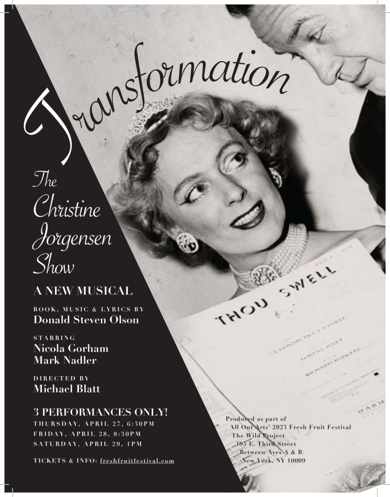 Transformation: The Christine Jorgensen Show is a new musical with book, music, and lyrics by Donald Steven Olson. The two-character play focuses on the relationship between transgender icon Jorgensen (played by Nicola Gorham) and seasoned song-and-dance man Myles Bell (played by Mark Nadler), whom Jorgensen recruits to help her pursue a career in the entertainment business. Directed by Michael Blatt, Transformation recently made its debut at New York City’s wild project as part of The 2023 Fresh Fruit Festival, and it was indeed an audience pleaser. The events of the play may have taken place in the 1950’s, but the story of Christine Jorgensen, and the larger push for transgender understanding and acceptance, is more relevant than ever as we enter the second half of 2023. Transformation is both entertaining and enlightening, with exquisite performances by Gorham and Nadler. But underneath the smart script, catchy tunes, and fine acting is a timeless message about believing in yourself and never giving up.