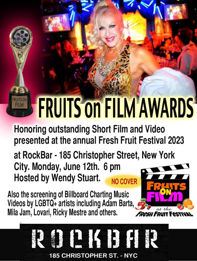 As part of New York City’s 2023 Fresh Fruit Festival, FRUITS ON FILM celebrated LGBTQ themes on Saturday, April 29th at New York City’s wild project with a diverse selection of short films and music videos. Hosted by writer/photographer Jed Ryan and NYC drag star Lady Clover Honey, it was a curated evening with music, comedy, drama, horror, drag, nudity, lesbian dating, and even a few Real Housewives of New Jersey! The films shown were: