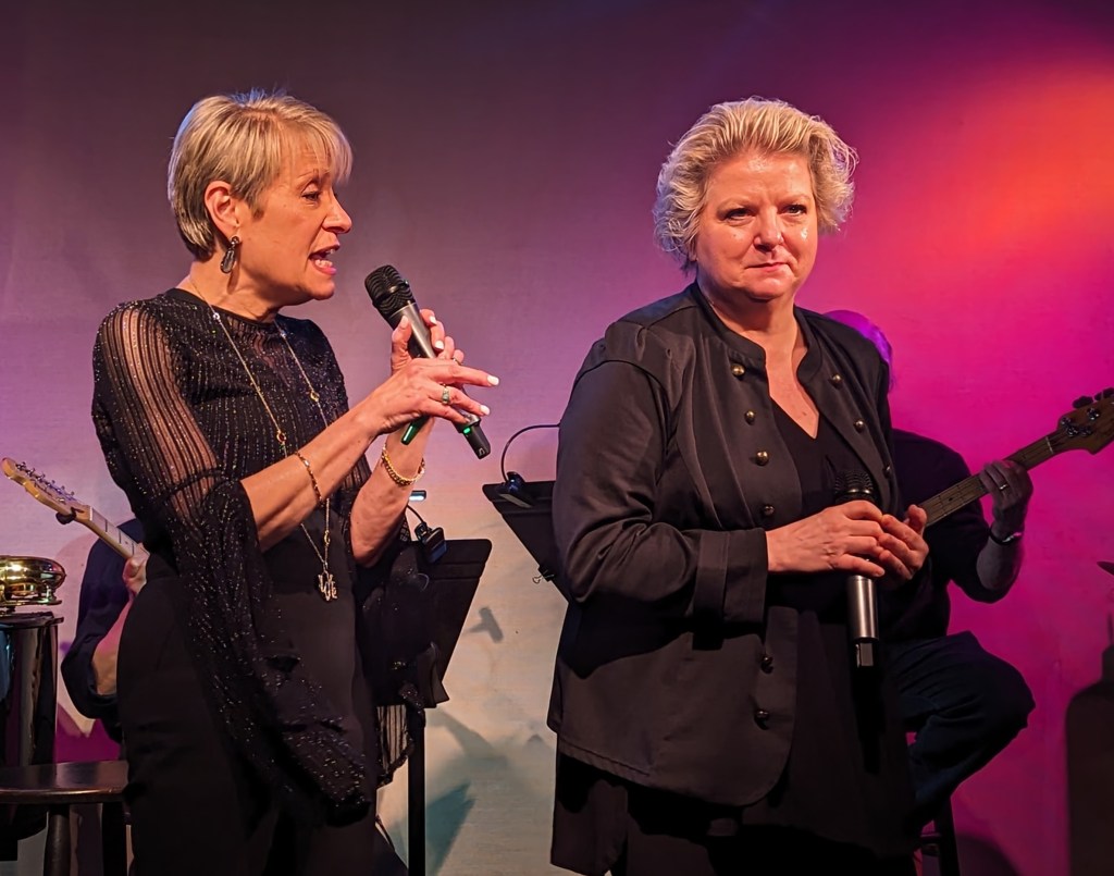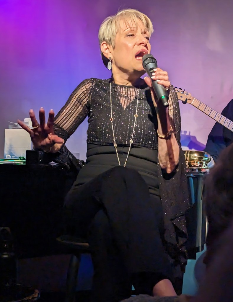 So, about that set list… Dver gets a lot of credit for choosing a transgenerational collection of popular favorites (from the likes of The Beatles, to Dusty Springfield, to P!nk and more) as weIl as some rare musical jewels just begging to be heard again. At one moment in Bridges, Dver announced the release of her very first CD, named Sweet Beginning. She declared, “Releasing my debut at 68 years old… Why not?!” The audience, of course, showed their overwhelming approval. Going with the theme, she launched into the wonderful I’m Glad I’m Not Young Anymore, set to a calypso beat and featuring some reowrked lyrics courtesy of Michael Roberts: “Not tied to my I-Phone like a drug; I’m perfectly fine with my Jitterbug!” Another great moment came with Spooky, one of thsoe aforementioned musical gems just waiting to be rediscovered. Dver’s vocals were perfectly accented by her trio of musicians. This may be a good time to introduce those musicians: John Miller on bass, Marc Daine on guitar and sax, and Chip M. Fabrizi on drums. Speaking of surrounding herself with talent: Dver’s Special Guest that night was multiple Awrad-winning performer, producer, and director Tanya Moberly. Moberly gave the audience Carole King’s Beautiful. When she sang that emblematic lyric “You’ve got to get up every morning with a smile on your face; And show the world all the love in your heart“, it was the e equivalent of a musical antidepressant. Tanya and Goldie joined forces for P!nk’s Bridge of Light. The two women’s distinctively different voices (Mobely’s “vox” is notably higher.) work very, very well together. In addition, the lyrics of the song– “That’s when love turns night time into day; That’s when loneliness goes away; That’s why you gotta be strong tonight; Only love can build us a bridge of light.”–couldn’t be more timely.