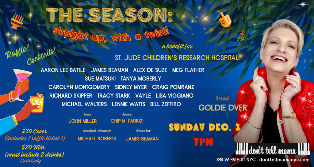On Sunday, December 3rd, New York City cabaret hotspot Don’t Tell Mama was exceptionally packed– but not just with audience members, as is almost always the case. On this night, there was lots of good will and (way) more than just one small thrill. The event was THE SEASON: Straight Up, With a Twist, a benefit for St. Jude Children’s Research Hospital. Hosted with humor and chutzpah by the lovely Goldie Dver, the event was directed by Dver’s friend and frequent creative collaborator James “Jamie” Beaman, with musical direction by Michael Roberts. What’s perhaps most astonishing is just how much talent, energy, and sense of charity was packed into the show’s tight running time. The artists’ seemingly perfect choices of music were a mix of re-energized holiday classics (We Need a Little Christmas), original songs (Christmas in Bed), and unearthed musical gems just begging to be heard again (Never Fall in Love with an Elf).