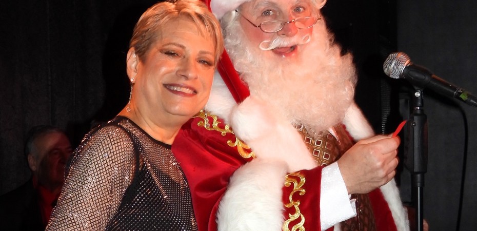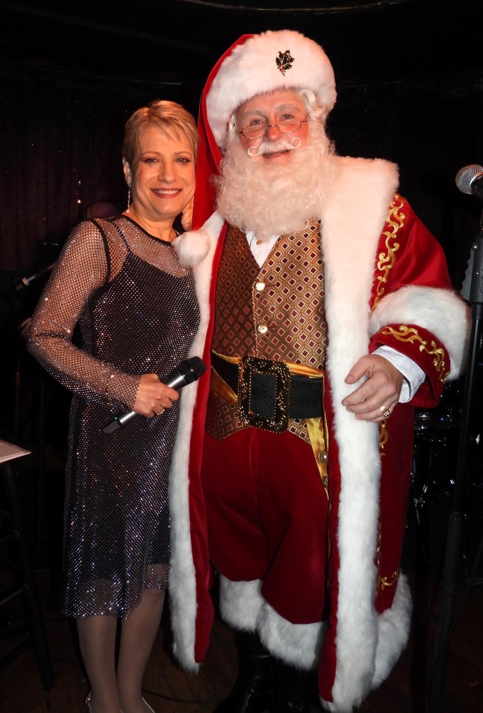 Many people object to using an “X” for “XMAS”… but I’ve yet to meet anyone who objects to the “X” in “SEXY”! With the unambiguously named Christmas in Bed (her own original song), Carolyn Montgomery reminded us that “naughty” can be nice… and that the most fun on Christmas usually comes AFTER the kids go to bed. It was yet another showstopper in an evening of many. The lovely Lisa Viggiano was next on stage, performing the provocative We Live on Borrowed Time. Her performance was no less than stellar. For a finale (Or was it?) Goldie was joined onstage with Alex DeSuze and Vayle, all with candles in hand, for The Chanukah Song (No, not THAT one!) But just the audience thought they’d be sent home for the night, there was an encore. Normally I would never reveal the encore of a show, but in this case, I have to reveal that the surprise guest was… Santa! (The Santa turned out to be Michael L. Walters,) Santa didn’t just “Ho, ho, ho!”. He chose the raffle winners for the MANY prizes, and even sang a song: White Christmas.