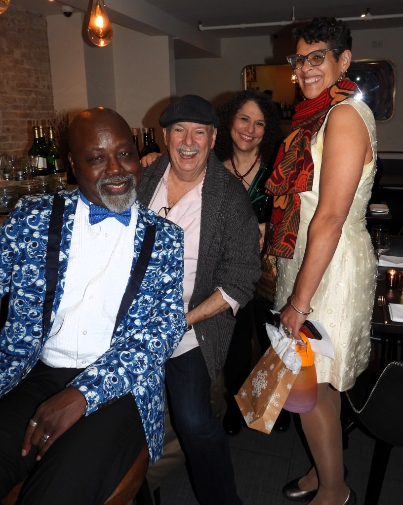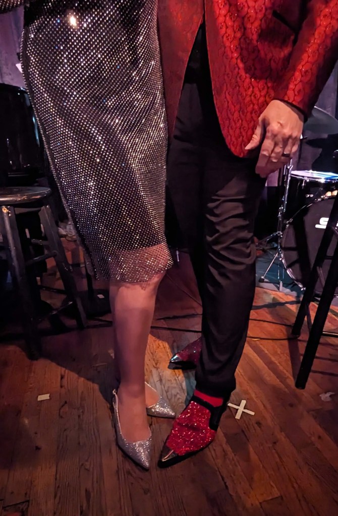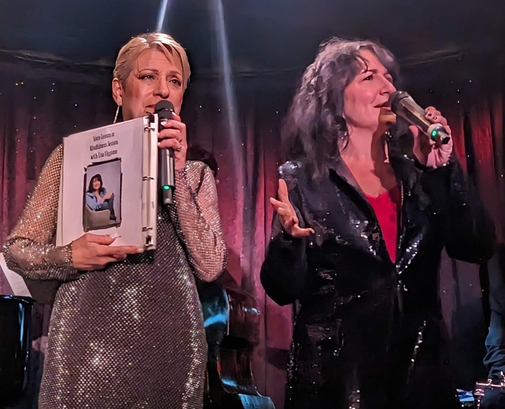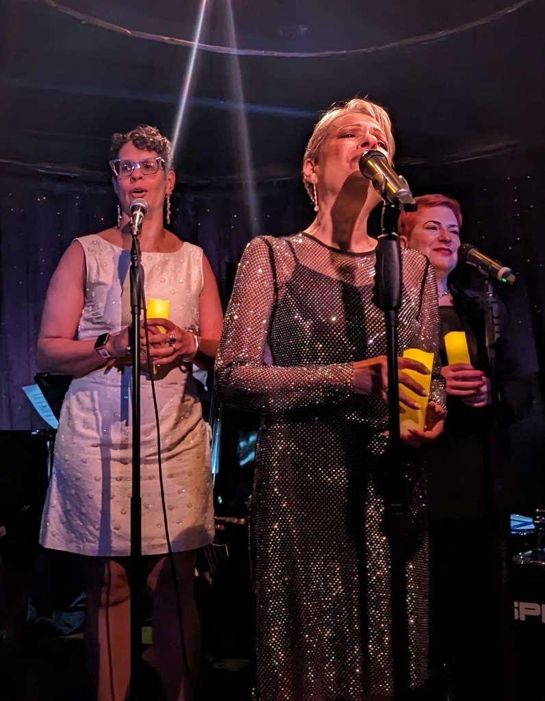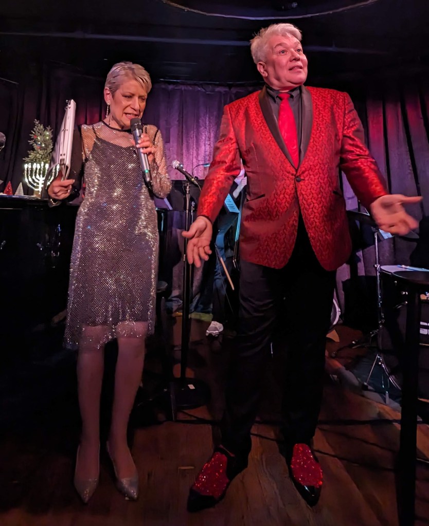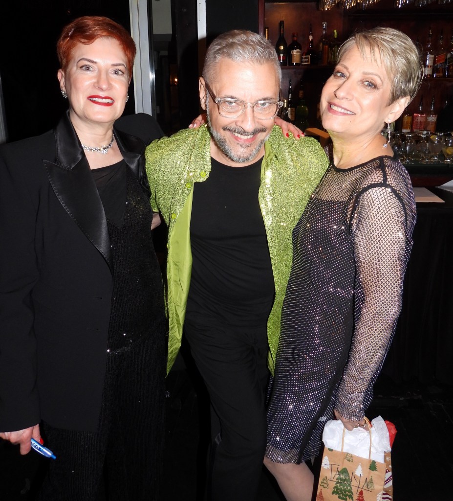 But about those 15 performers: Goldie Dver didn’t just announce the lineup: She sang about it in Just Leave Everything to Me, an adaptation of Jerry Herman’s classic from Hello, Dolly! with reworked lyrics by Jamie Beaman: Everyone in the show was mentioned in the song! It takes moxie to be able to create lyrics like, “I’ve got Lisa Viggiano, talented Italiano…! “ This version could should be considered a new cabaret classic as we approach 2024. Next up was Tracy Stark, with her original and beautiful Perfect Christmas. She joked that it was “in keeping with the tradition of Jews writing Christmas songs”! (Others, FYI, include Rudolph the Red Nosed Reindeer, Chestnuts Roasting on an Open Fire, Santa Baby, and many more.) The song was, well… “perfect”. Next up was Meg Flather. It’s worth mentioning at this time that while all the performers of the night were warmly received, Flather’s entrance to the stage was exceptionally enthusiastic (Remember that for later…). She met those expectations and then some, giving the audience a zesty new incarnation of the eternal Auld Lang Syne segueing into her own original It’s About Time. Flather also offered some inspirational words for the dawn of 2024: “What’s interesting about our community is: We’re not youngsters. And I really love that! We’re just getting started– and we’re getting better, and better, and better with age!” Brava! When Stark joined Flather on vocals, the result was no less than transcendent. If Dver’s performance two songs earlier should be considered a new staple in the proverbial Great New York City Cabaret Songbook, then Flather’s piece should become a new classic for New Year’s Eve (my favorite holiday, incidentally…)