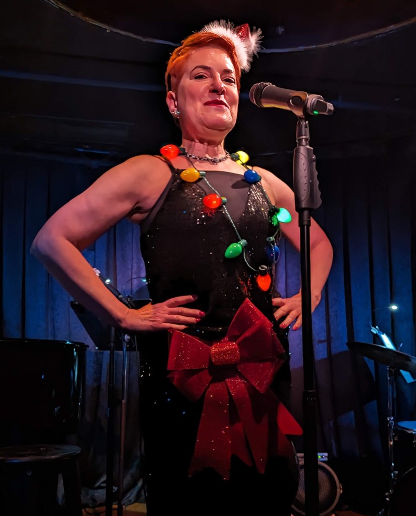 Amongst a lineup of seasoned cabaret performers– most of whom had their own solo shows and many of whom had recorded their own CD’s– there was a performer who was making a “return” of sorts to cabaret: Vayle. This was her first time performing for a live audience in a while, but no one would have known it. (I only knew myself because her friends, sitting at the same table as I, told me so…) Performing the well-chosen I’m Your Christmas Present, she was sexy, funny, and charismatic. Vayle was followed by Lennie Watts, who gave the crowd the underappreciated Celebrate Me Home. His version was soulful, bluesy perfection… and a real crowd-pleaser. Next up was Alex De Suze, who gave the audience the offbeat holiday gem Five Pound Box of Money. Originally made famous by Pearl Bailey, the song was perfectly suited for De Suze’s sassy charms. This just might be my new favorite holiday song!