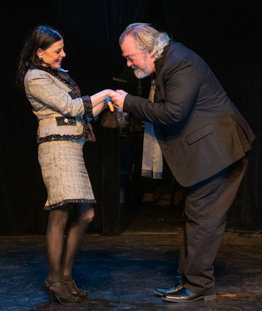 But back to “larger-than-life”… Brad Fryman is perfect as Orson Welles, the American director and actor whose transgenerational legacy on pop culture can never be overestimated. (The Orson in this play, incidentally, would wholeheartedly agree…) Welles, in all his blustery yet undeniably charismatic glory, is concerned that the best of his creativity may be behind him. At one point he declares, “Hollywood has not known who I am since 1948.” He is having a hard time raising money for his next movie. Welles is also quick to frequently remind the audience, “Olivier destroyed me in Hollywood. Did you know that?… Never mind. I’m not going into details, but he destroyed me in Hollywood in 1948.” Surely enough, the audience soon gets to meet the “dashing” Laurence/Larry Olivier (Ryan Lamont) in the play’s second act, who the character Ken refers to as “the greatest actor in the English-speaking world”. (Mr. Olivier himself would eagerly make that claim as well…). Personally, Olivier is in a declining marriage with the emotionally fragile Vivien Leigh and is moving towards an intimate and creative relationship with Joan Plowright. (The two would marry in 1961.) Like Orson Welles, Olivier’s talent is unquestionable. But could these two men keep their over-the-top personalities in check to work together creatively?
