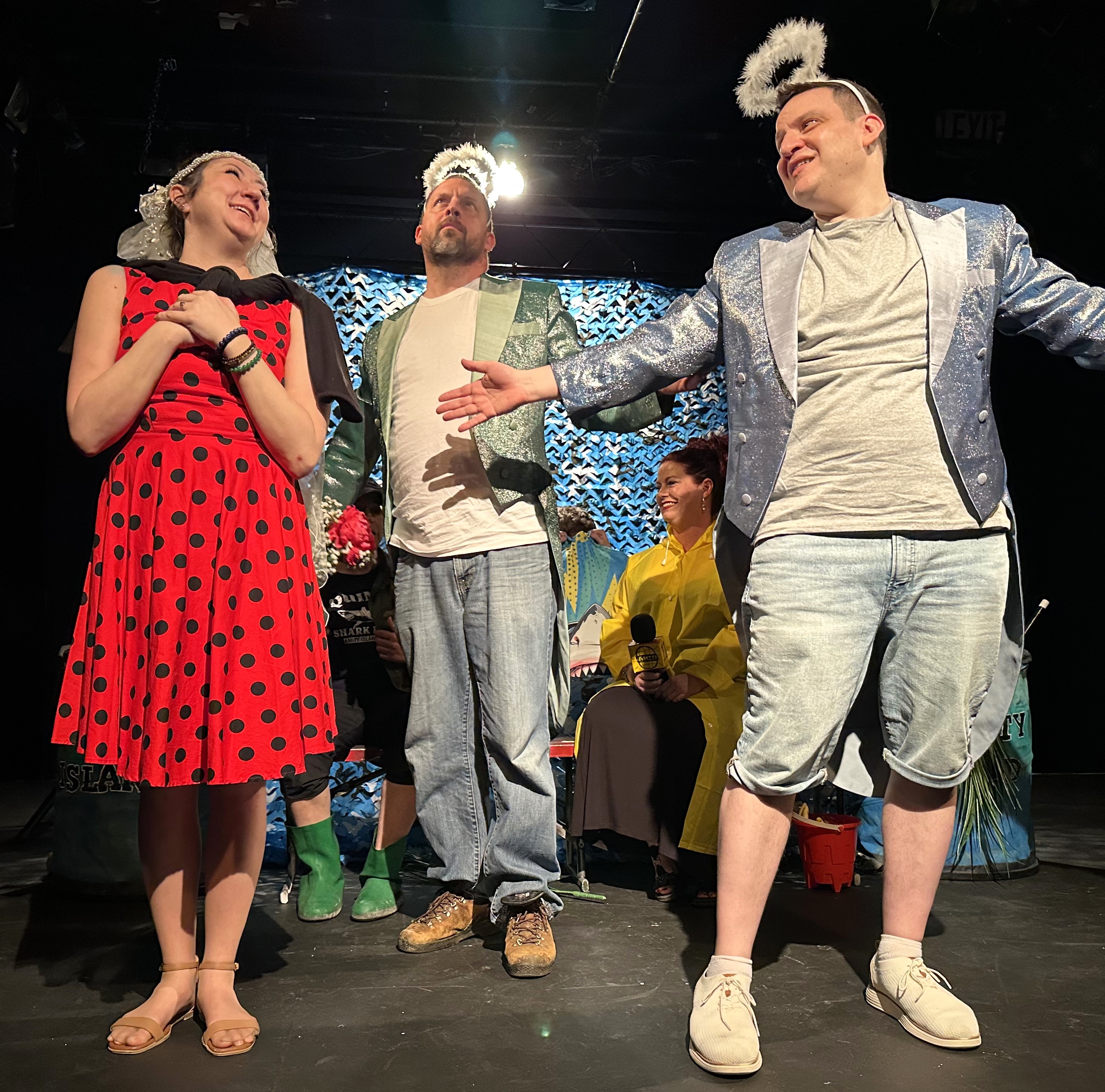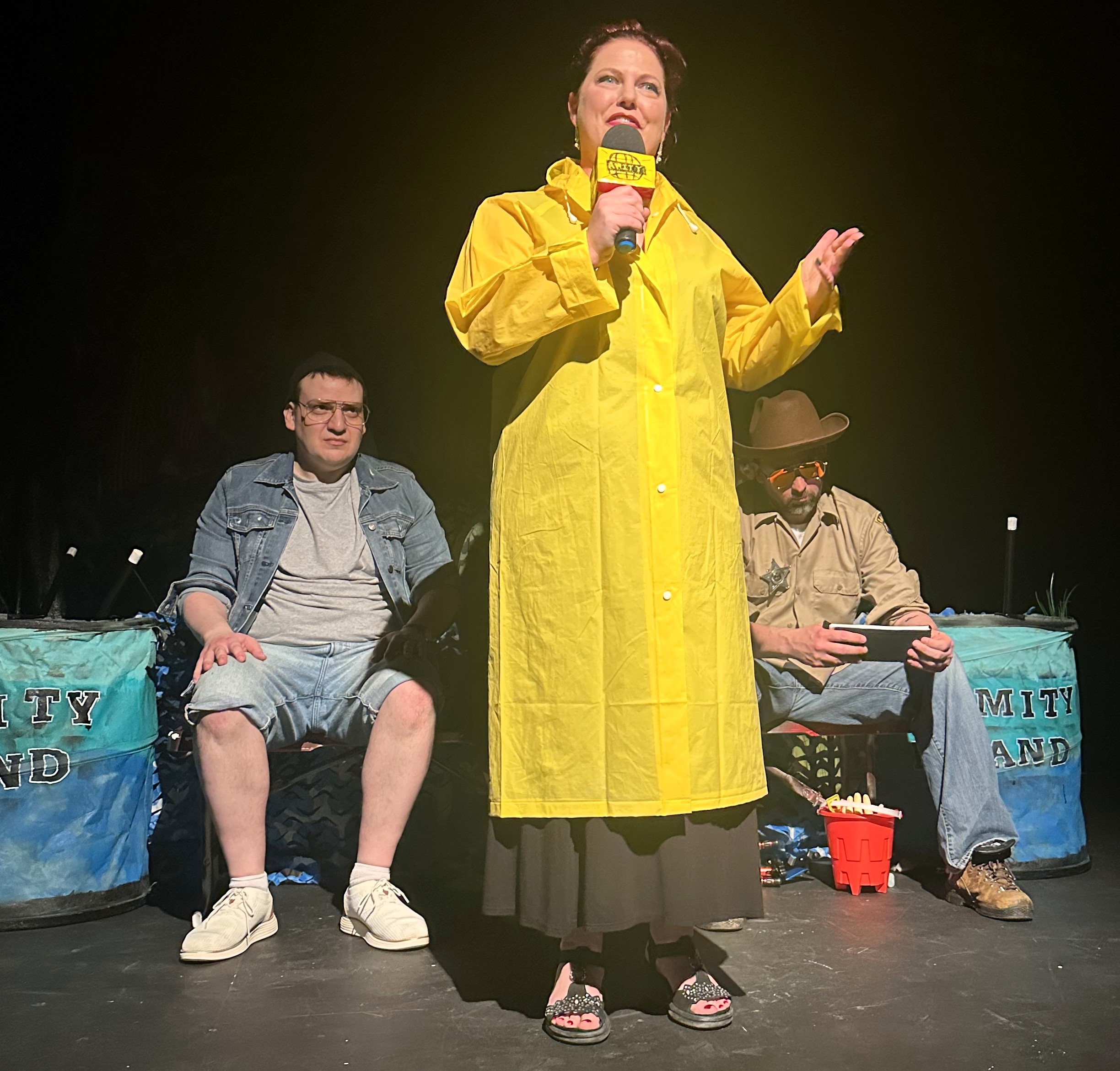 By now, Jaws fans may be wondering about the OTHER characters from the movie: Quint and Hooper. Quint (played by Suzanne Stein), a cinematic character who has seemingly been patently made for caricature. Quint appears complete with the now iconic nails-on-chalkboard entrance (He brings his own portable chalkboard!), to vie for control of the shark-hunting mission. Quint even gets his own song, and… tap dances (!), which the audience really went wild for. Soon afterwards, “marine biologist extraordinaire” Hooper (Wayne Henry again) also appears. Can the threesome of the tough-talking Chief Brody, the gravel-voiced Quinn, and wide-eyed Hooper “catch and kill” the shark? Well, they do catch the shark… whose name is (Get ready…) “Dennis”. And, (Get ready again…) this shark SPEAKS! (He also sings… but more about that later.) How would the shark from Jaws look as a human? Well, he’s played by Robbie Stevens Jr. and is costumed by Tiffany L. Thornton. Let’s just say that if you can imagine being stoned while watching too much black-market UHF TV back in the ’80’s, this is pretty spot-on for what JAWS: the Human! would probably look like. The “Carcharodon carcharias” in this production is motivated his good old-fashioned L-O-V-E for the character Sally. Hey, it’s certainly no less of a motivation than a shark swimming 1,193 miles to the Bahamas to seek revenge… but that’s another musical. The climax of this show comes when all six characters– Brody, Quint, Hooper, Sally, Mayor Vaughn, and Dennis– meet up for a showdown at Amity Cove, “Amity Island’s (not-so-secret) best-kept secret“. We learn that the flamboyant Mayor Vaughn has some, well, “wicked” intentions. Will true inter-species love triumph?