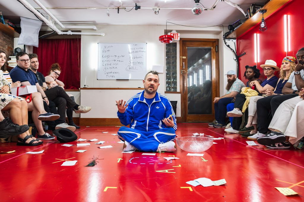 Mr. Holder is a New York City-based, award-winning actor and playwright. He does more than just write plays, however; Holder shared with the attendees that he also used to teach people how to write their own plays. For the uninitiated, there’s the (1) exposition, (2) rising action, (3) climax, (4) falling action, and (5) resolution. (Remember these terms, because there will be a test… they will come into play later.) Holder’s resume and skills notwithstanding, Out of Order is NOT a play– at least not in the classic way we think of “plays”. Officially described as “an interactive parlor game”, Out of Order is indeed an original theater experience– and a fine one at that. The originality comes largely from the piece’s idiosyncratic structure: Holder takes random index cards from a fishbowl in the middle of the stage, and the written instructions guide his actions; Therefore, every performance is almost guaranteed to be different. The handwritten cards range from “Ask for help!” to “Be brave!”. The experience is also intimate, and not just because of the small space of East Village Basement. Thanks to the stories Carl shares about his career trajectory throughout the show’s 90-minute running time, it’s a VERY personal show; At times, its achingly and nakedly candid. At the same time, Holder’s story is also very relatable to any of his fellow artists trying to navigate their way through our beloved New York City. In sympathy with the lives of so many other performers, his shared experiences feature both soaring highs and crippling lows. The creative and emotional fluctuations are so wonderfully symbolized by the ebbs and flows of, let’s say, a bank account… and, by the way, Holder shares his own bank account with the audience in one segment as well. (I warned you that the show was “intimate”!)