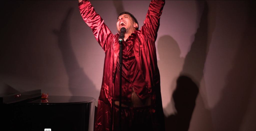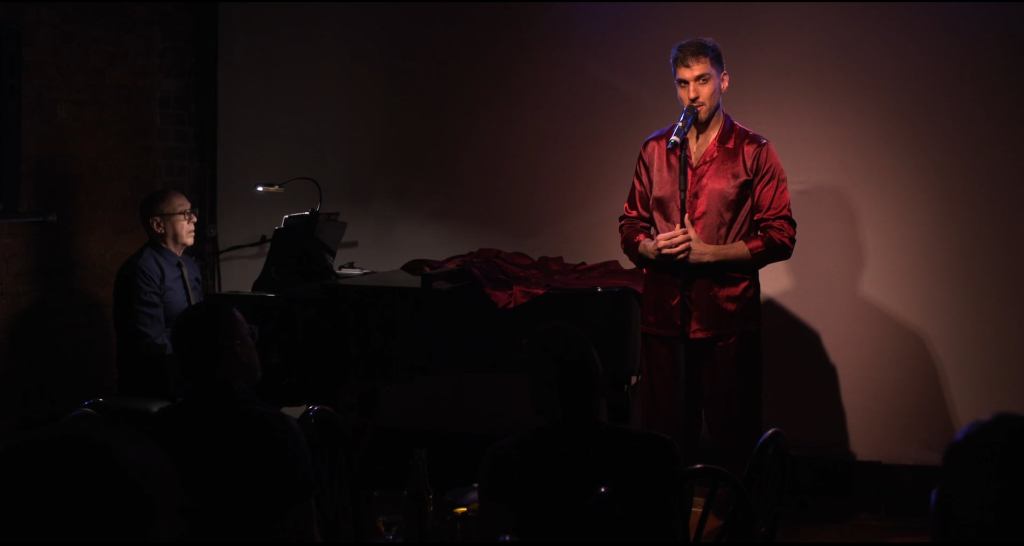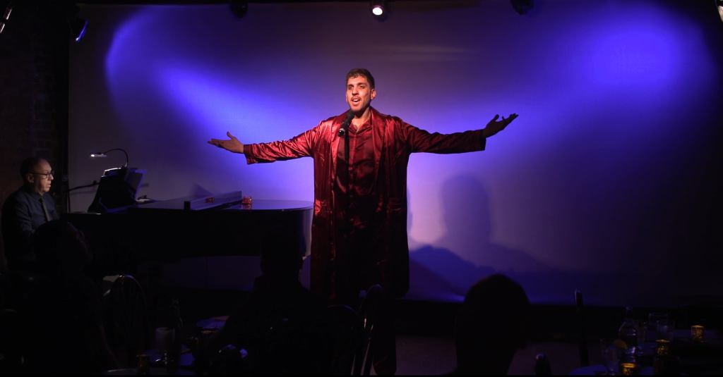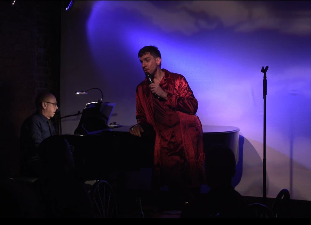 With the titillating title Love or Death?, it’s a safe bet that the audience didn’t quite know what to expect with dynamic actor/singer Bruno Giraldi’s new performance piece, playing for three dates at New York City’s cabaret hotspot Don’t Tell Mama. With his selection of music, Giraldi certainly had his work cut out for him. His choice of songs was a transgenerational playlist of beloved musical selections. There were classic showtunes as well as gems from relatively newer works like Hedwig and the Angry Inch and Cry Baby, with artists as diverse as Bette Midler and Eric Clapton. However, with Love or Death?, the artist also challenged the audience to… well, THINK! How HARD the audience was challenged to think probably depended on how much of a romantic they considered themselves, on a scale from 1 to 10. Love or Death? is indeed an original cabaret experience, right on from the very beginning. As the attendees entered the intimate space of Don’t Tell Mama, warmed up by the piano skills of the hardworking John Bowen, the artist was on the small stage curled up underneath a large blanket– with only a few astute viewers close to the stage perhaps noticing that the blanket was rising with his breaths. Finally, at the right moment, Mr. Bowen pulled the blanket away, revealing the singer dressed in cabaret cabernet-colored silk jammies and a matching robe. He launched into Queen’s Somebody to Love. How’s THAT for a memorable opener?