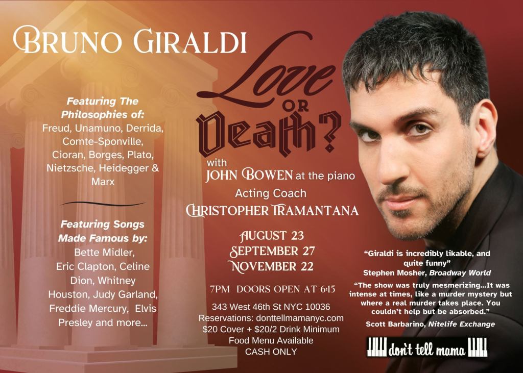 Bruno Giraldi’s Love or Death? continues on Saturday, September 27 and Saturday, November 22 at 7PM, at Don’t Tell Mama, 343 West 46th St., NYC. Make reservations at http://www.DontTellMamaNYC.com.