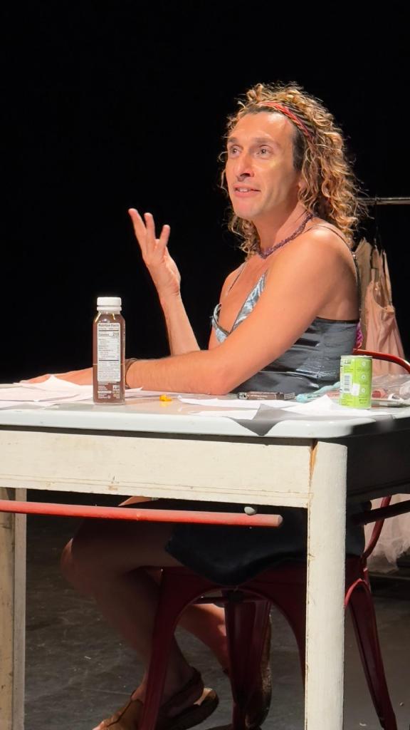 As Sylvia opens with Minerva’s character receiving the colloquial “dick pic” by someone named “Dante the Alpha TOP”– a very modern phenom for which I’d give ANYTHING to know how the late Sylvia Rivera would have reacted to, BTW… The moment sets the stage for Minerva’s young, Italian-American, transfemme character getting ready for a date, which the audience gets to watch. This character is enjoying a playful albeit cautious sense of freedom which Rivera, arguably, may never have gotten to enjoy herself– but who was indisputably a force in helping get there today. The opening moments of As Sylvia are both hilarious and oh-so-real for anyone who is navigating the battlefield of queer dating in 2025. There’s even a funny but sweet preparatory incantation of sorts dedicated to the “pioneers of drag”. One of the items which is unmistakable in the character’s apartment– even from the last row of the theater– is a framed black and white photo of Sylvia Rivera– AKA “Mother Sylvia”. The character reveals how, in college, they performed as Sylvia in a “living exhibition”. The performer dutifully did their research. Soon afterward, it became a mutually inspirational relationship, with Rivera acting as a no-nonsense modern-day muse and Summer Minerva’s plucky heroine keeping the activist’s legacy alive.