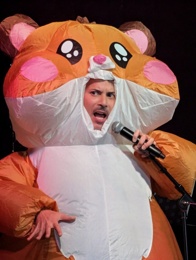 Even in a city like New York where there are an infinite amount of things to do every night (Yes, even on a Tuesday…), Barbarino’s Big Nite Out! is truly the hottest ticket in town. A lot of the credit goes to Host Joshua “Chachi” Cruz. He’s funny, energetic, and, shall we say, ” easy on the eyes”. Any host who would come out in an inflatable hamster outfit could do no wrong by me. Although Cruz joked about how “ridiculous” he looked, I thought that he looked rad as hell.