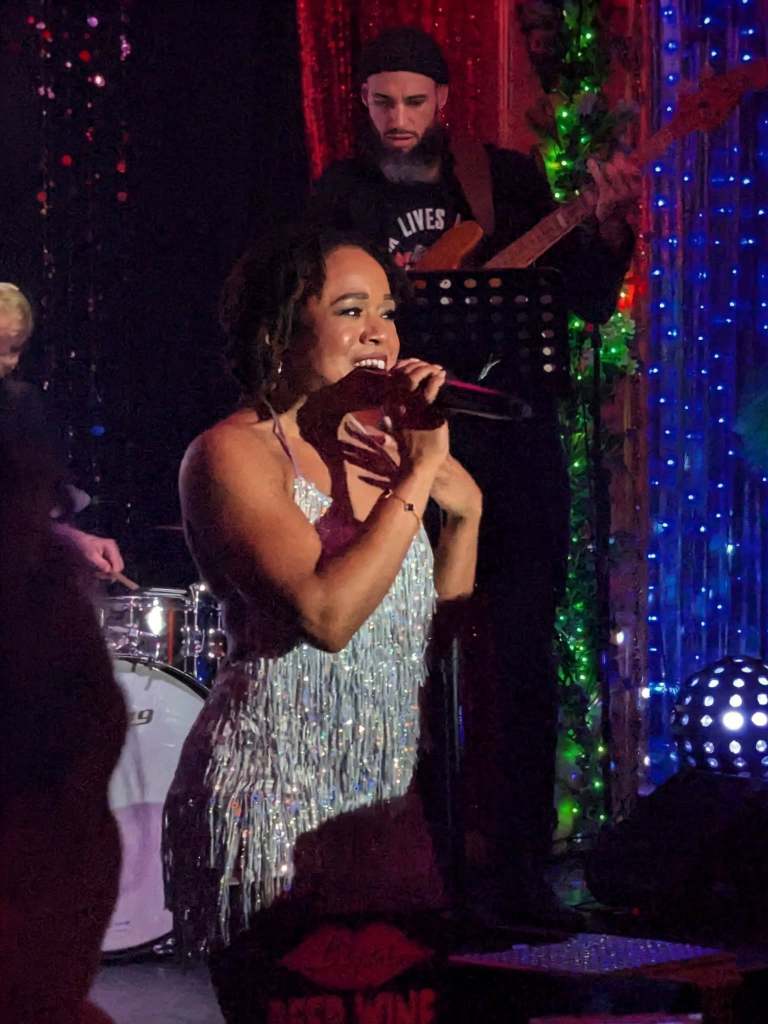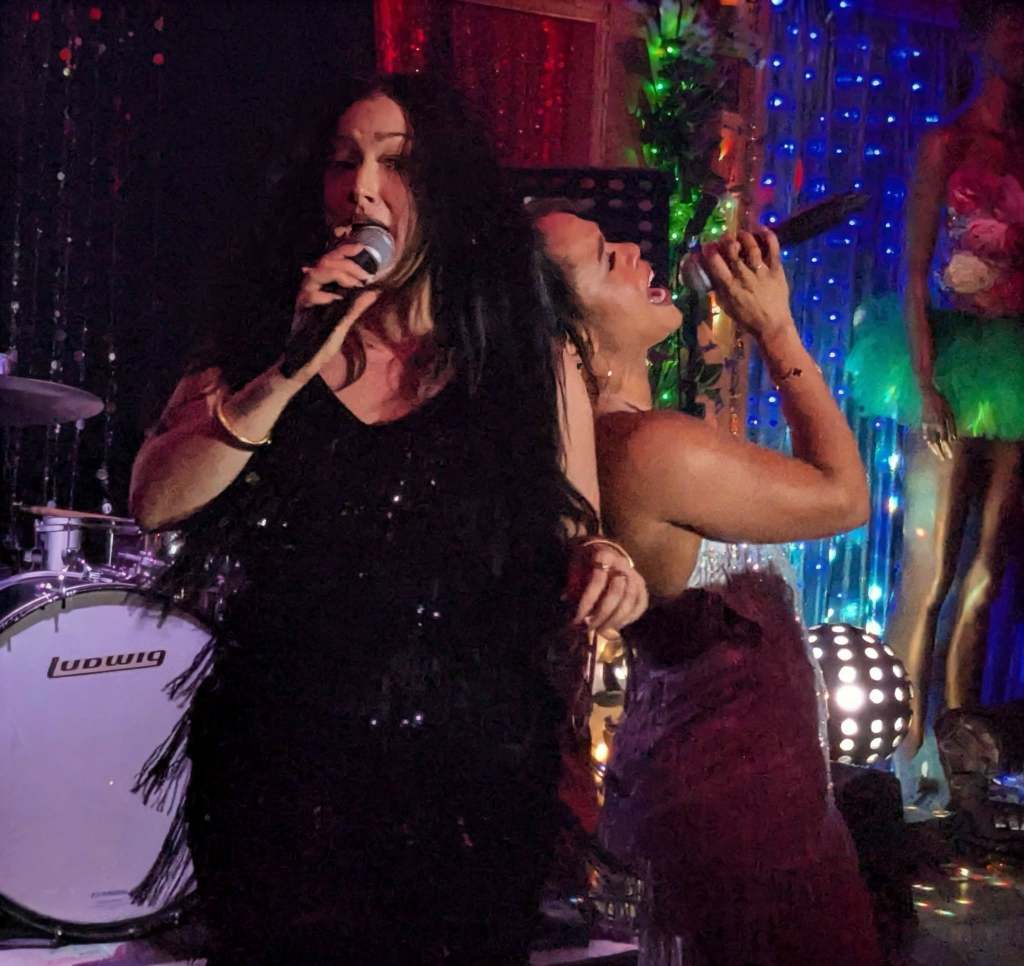 But before we the audience at Lips even heard the very first song of the night, we were treated to an overture by the hardworking four-man band of the night: Alex Nguyen on trumpet, Yasuhiko “Yaz” Fukuoka on piano /keyboard, Drew Bastion on percussion, and Ian Jesse on bass. An overture?! Yes, kids: This is a CLASSY event! Head honcho Scott Barbarino gave the audience the Neil Sedaka classic Calendar Girl, which was particularly well-suited for his smooth, mannered vocal style. Barbarino wanted the song to evoke the spirit of New York City’s piano bars of old, where the whole place would sing together. So when he did his next song, Tony Orlando and Dawn’s Knock Three Times, the crowd not only sang together, but also “knocked three times” together. And, amazingly, there were no broken glasses. Next up were two favorites of Barbarino’s Big Nite Out!: Bianca Di Sarro and Zach Carter. The pair performed I Got You Babe, as a tribute to the real-life married couple who not only made that song famous but who also, as Chachi Cruz pointed out, made variety shows cool. Bianca and Zach– who, as far as I know, are NOT married in real life– have very visible chemistry together. For this number, the audience didn’t need any encouragement to sing along. Gabrielle Elisabeth was next, performing the eternal classic One Fine Day. She’s a lovely presence, and she has a truly lovely voice to match, especially as she sings lyrics like “One fine day, you’re gonna want me for your girl…!” Gabrielle and Bianca combined forces for the superfunky Shame, Shame, Shame. It was a true highlight of the night to hear this duo scold the audience with, “Can’t stop me now, hear what I say; My feet want to move so get out of my way!” You MUST obey…